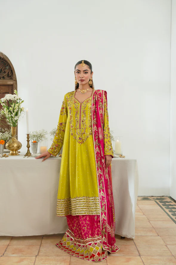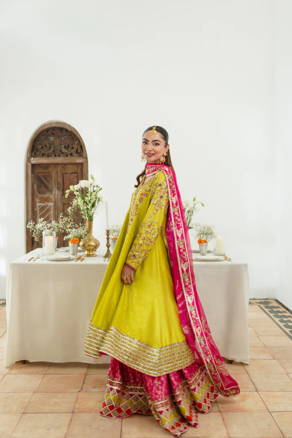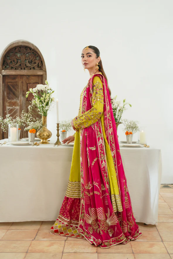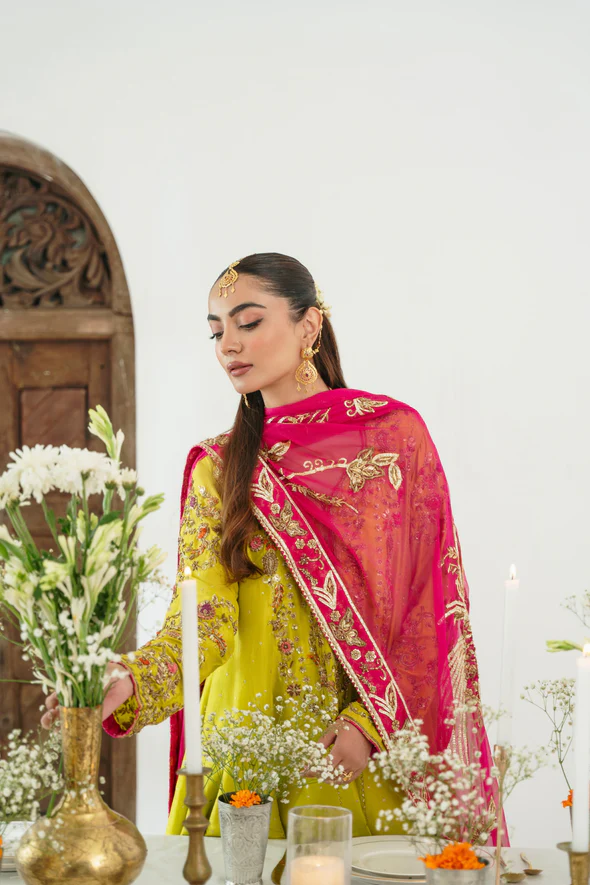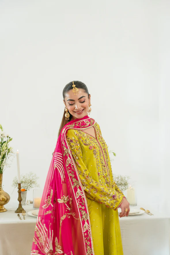 Rich traditional hues accented with a vibrant hot pink dupatta and luminous metallic detailing.