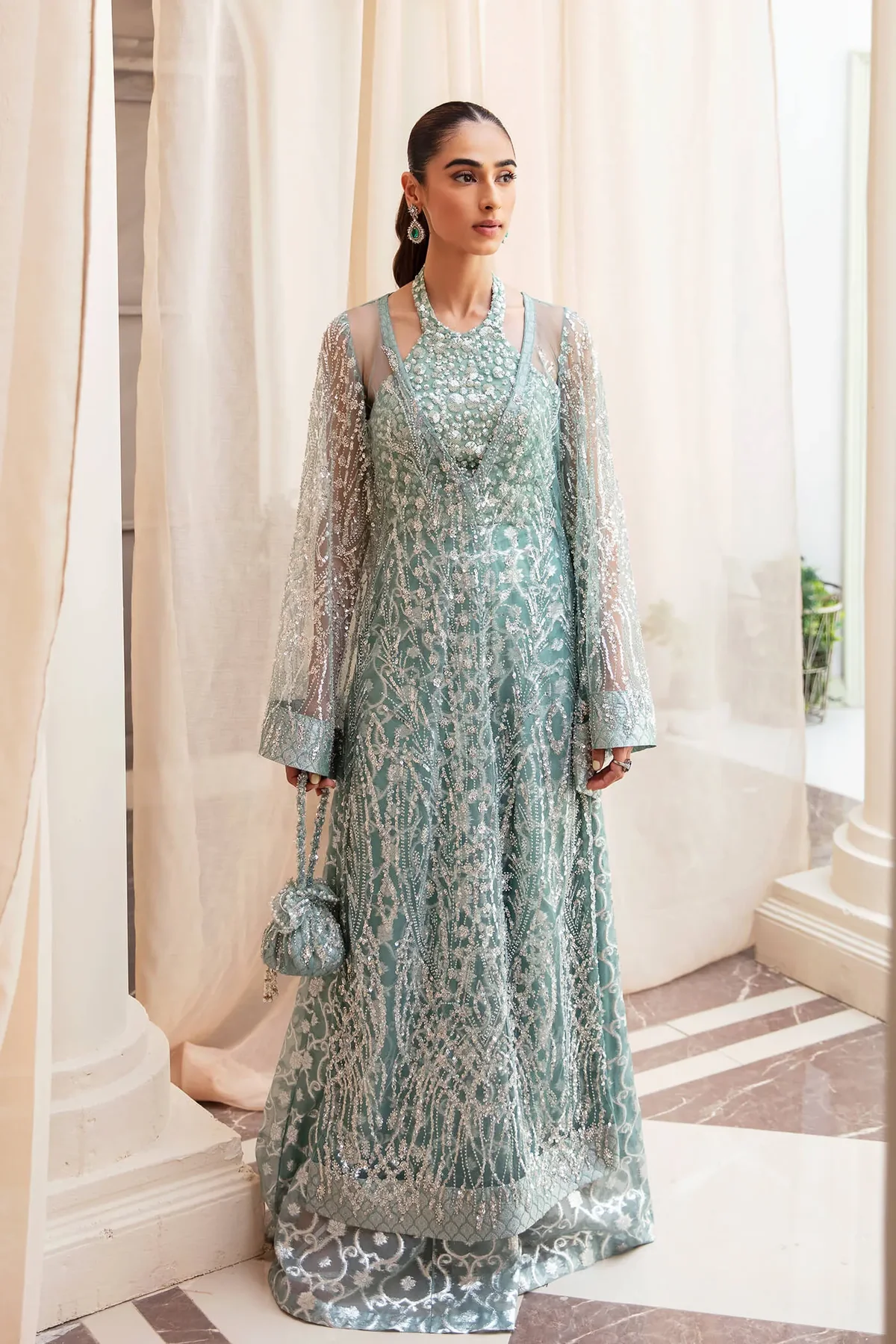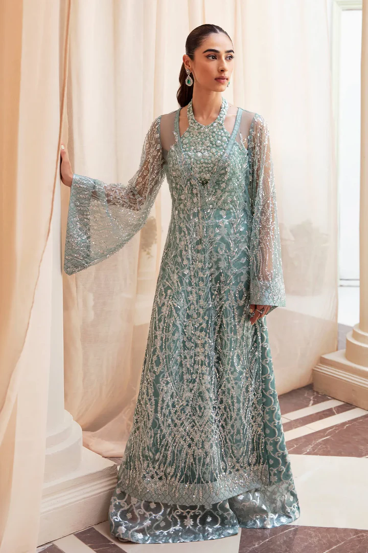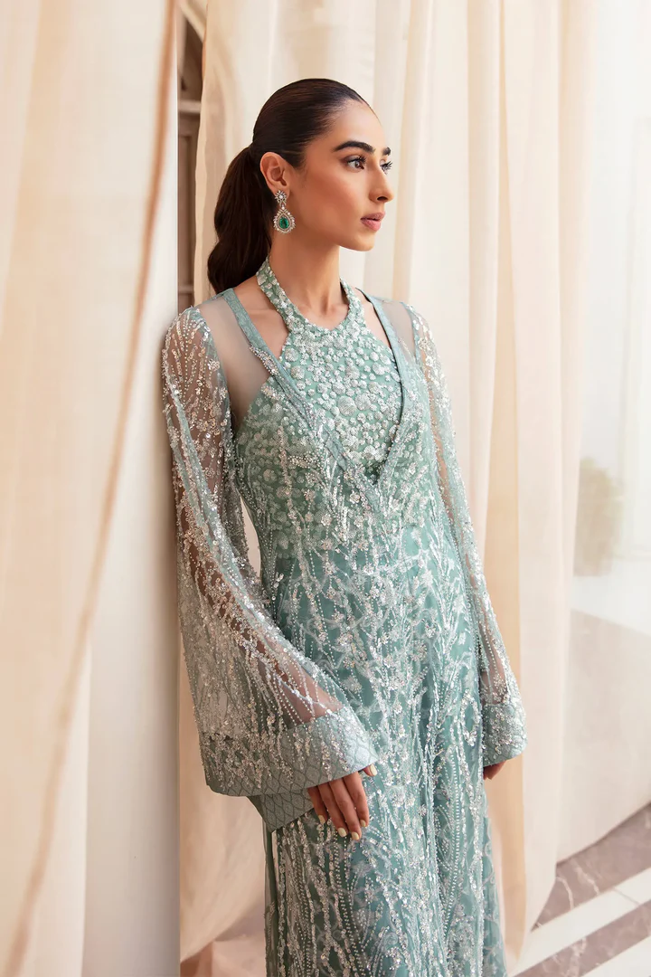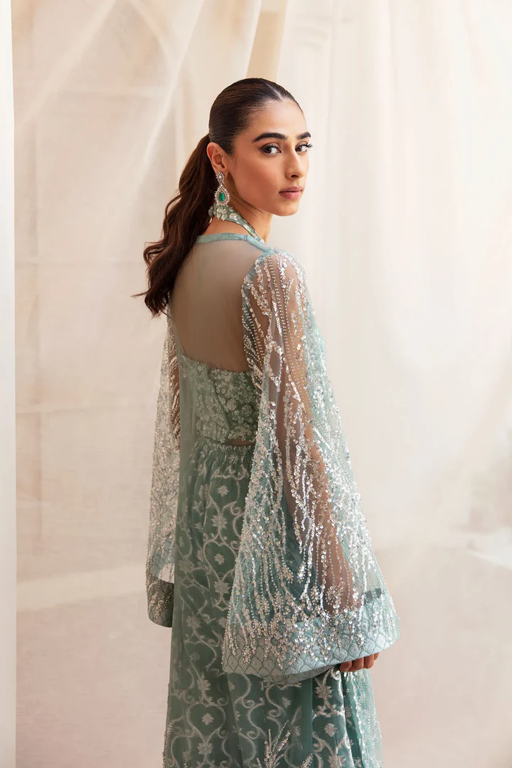 Paired with the kameez is a coordinated sharara designed in matching tones, tailored from premium raw silk. The silhouette features a graceful flare that adds movement and grandeur, while elegant trims along the hemline enhance its traditional appeal. The structured yet flowing design beautifully complements the ornate kameez, completing the look with timeless sophistication.