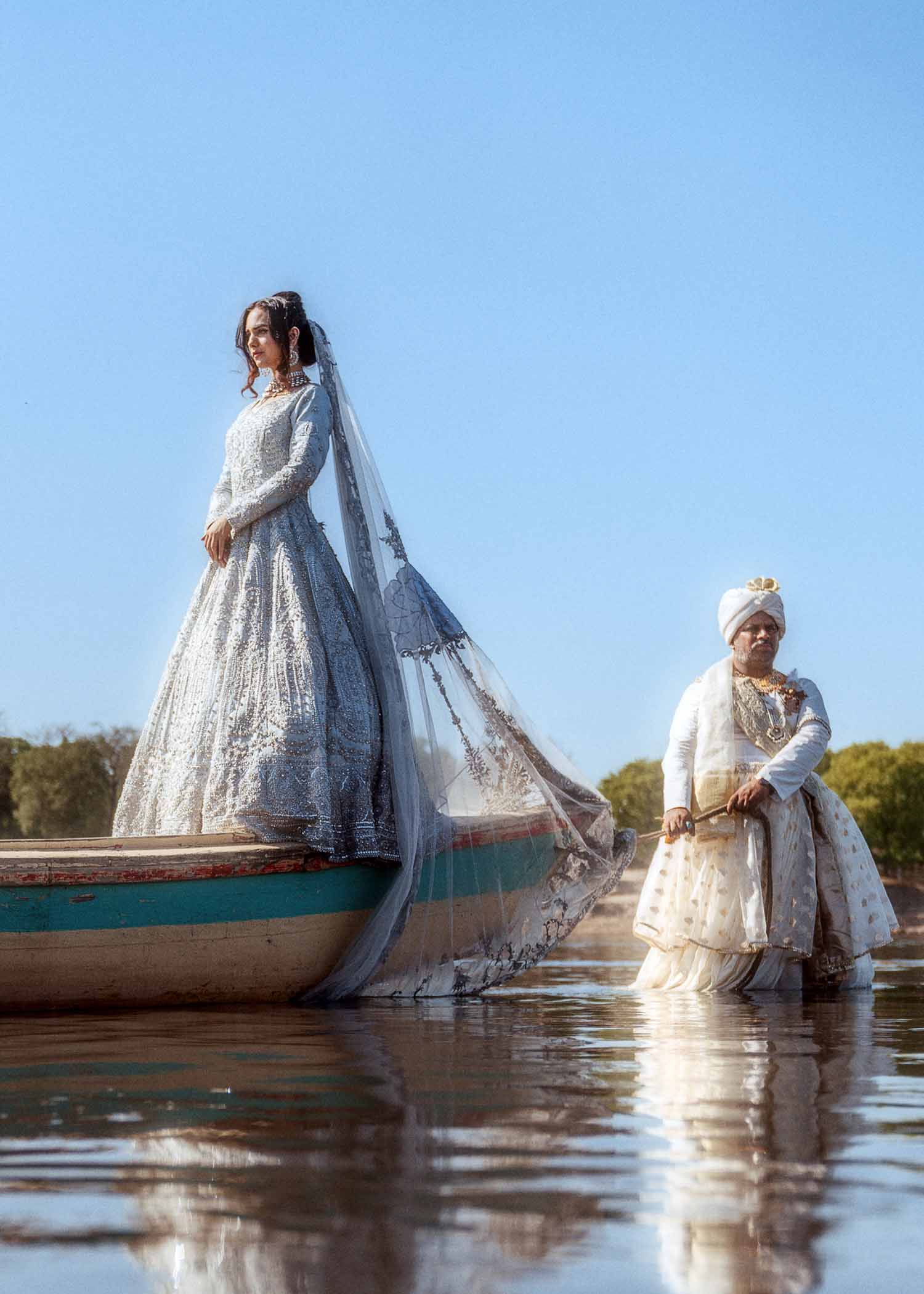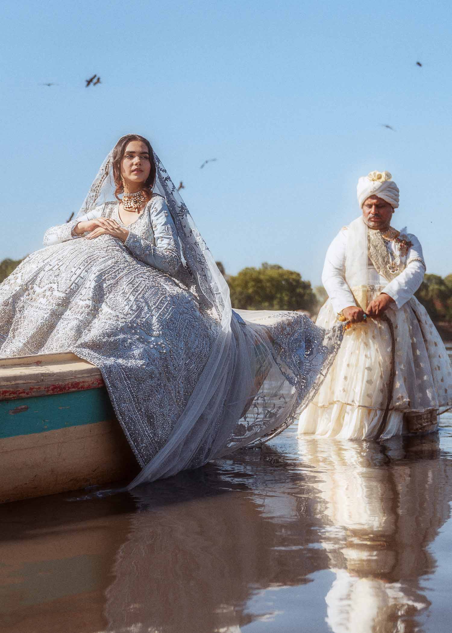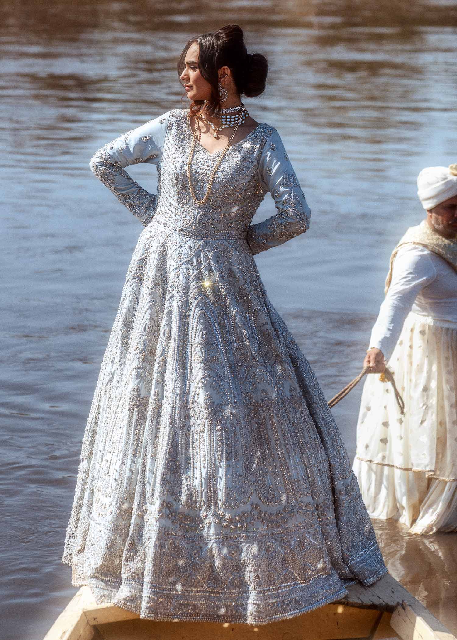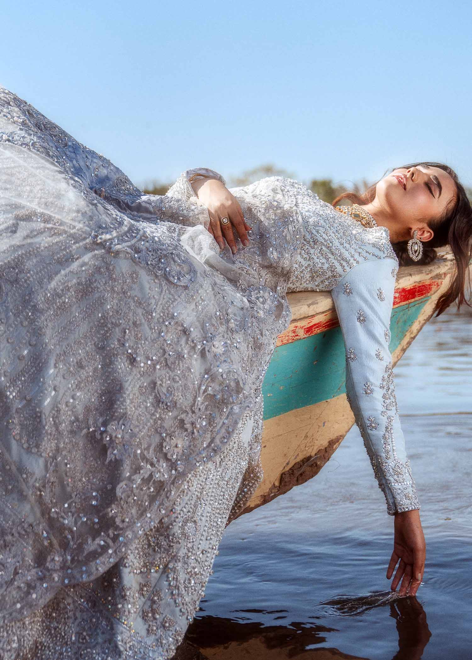 The one piece is crafted from pure raw silk in a serene ice blue tone and designed in a modern, streamlined silhouette. Shimmering silver hand embellishments are intricately applied using swarovski crystals, naqshi, sequins, and pearls, creating a luminous surface with depth and elegance. The structured design is supported by a smooth inner lining, ensuring comfort while maintaining a refined and polished form.