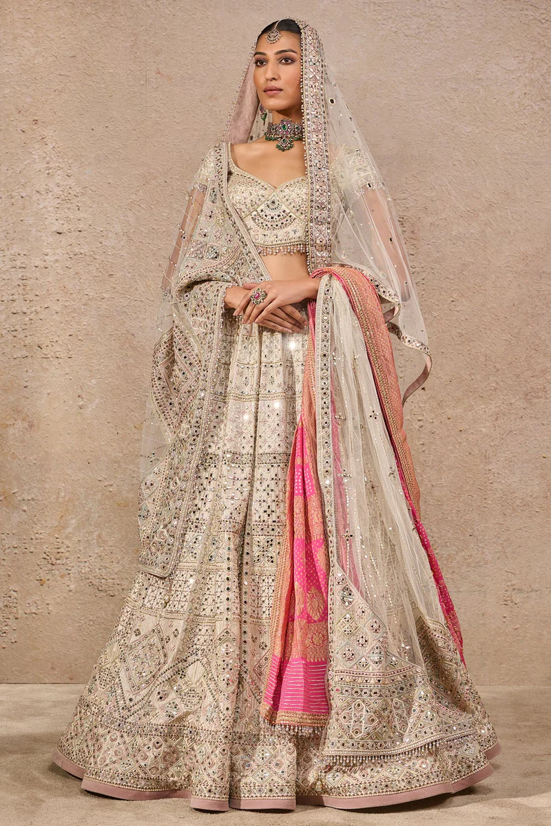 A breathtaking ivory bridal masterpiece featuring exhaustive mirror-work and geometric hand-embroidery, paired with a vibrant fuchsia Bandhani accent dupatta for a regal, multi-layered aesthetic.