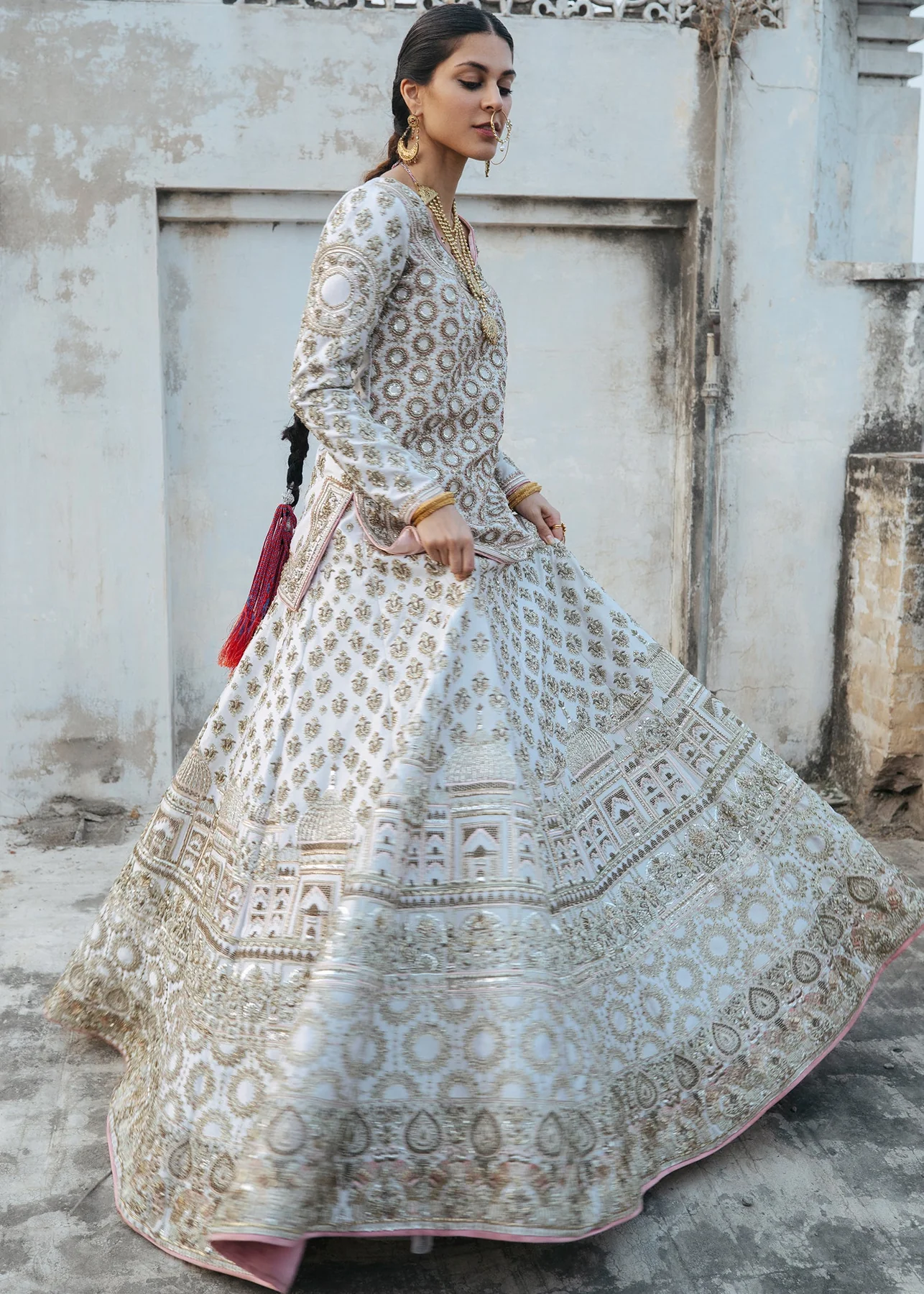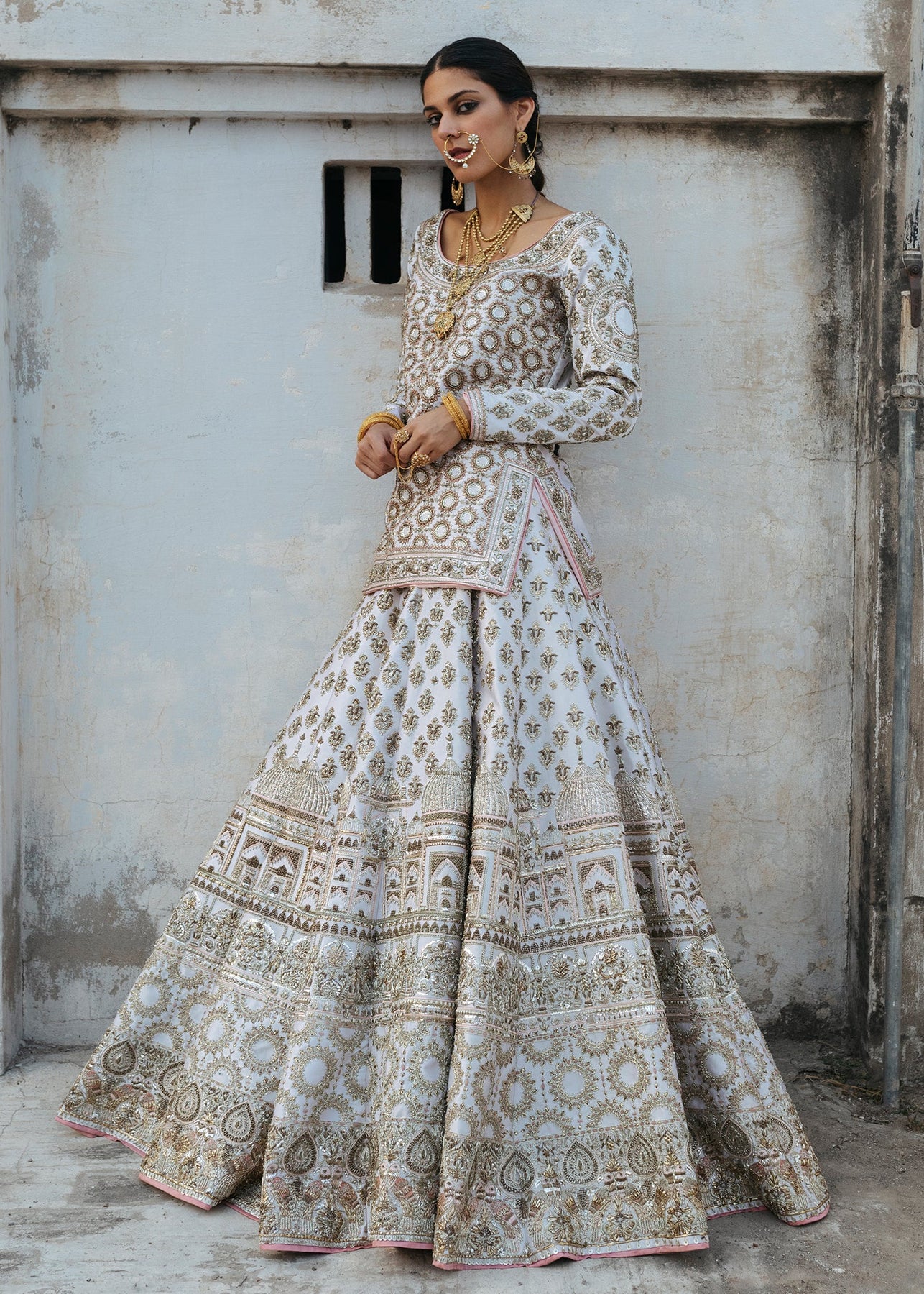 The ensemble is completed with a stunning raw silk lehenga, fully embellished with coordinated patterns that mirror the kurti’s craftsmanship. From delicate floral vines to gleaming handcrafted details, the lehenga unfolds in a majestic silhouette that elevates the entire outfit with royal charm. Its structured flare enhances movement while maintaining a regal, voluminous presence.