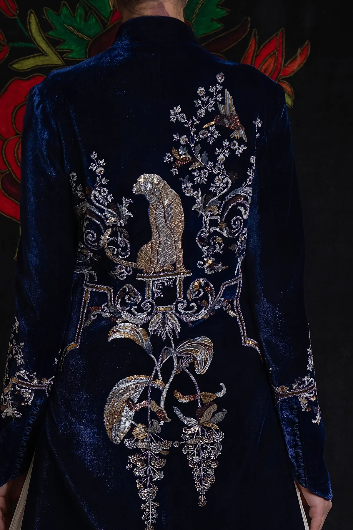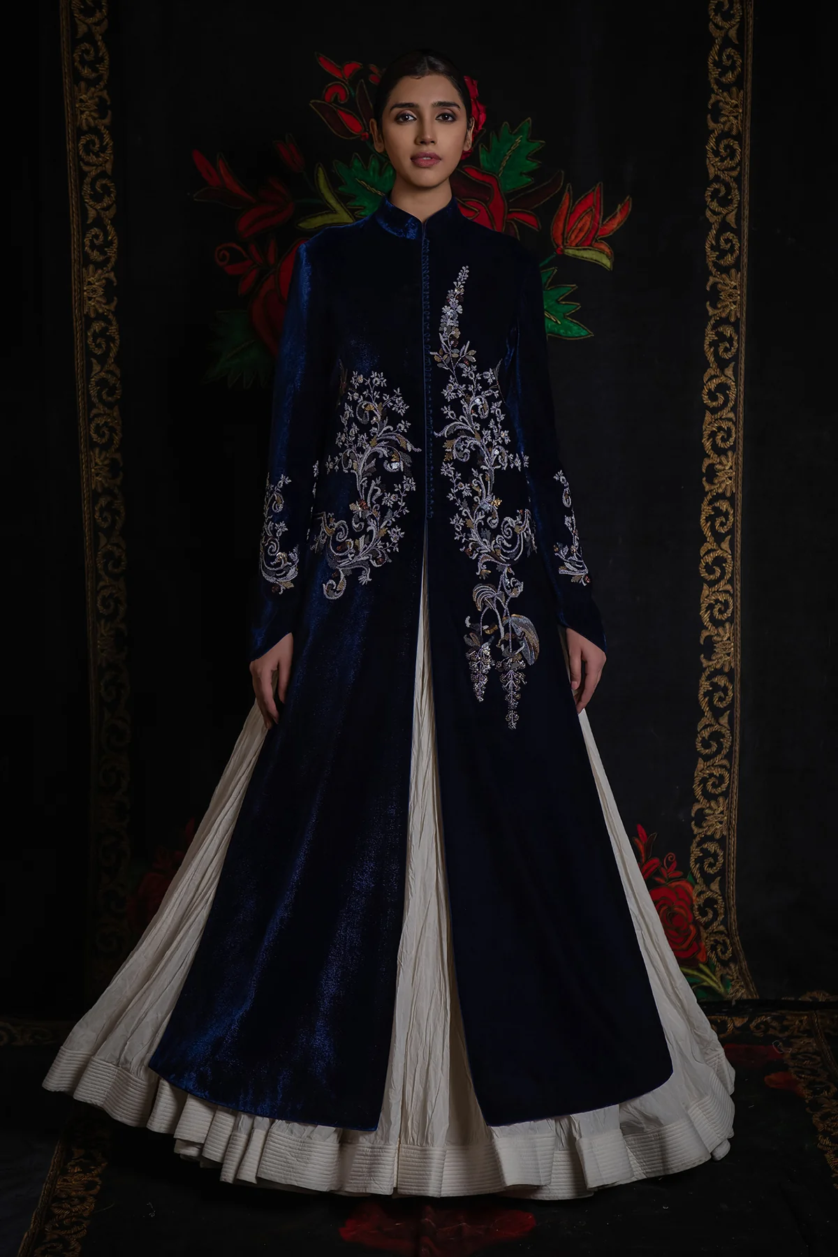 The long jacket is crafted from premium velvet in a deep indigo shade, offering a rich and regal appearance. Intricate embroidery decorates the front panels, neckline, and sleeves, creating a sophisticated interplay of texture and design. The velvety surface enhances the detailing, while the inner finishing ensures comfort and structure. Clean edging and smooth tailoring give the jacket a polished, statement look suitable for festive and formal occasions.
