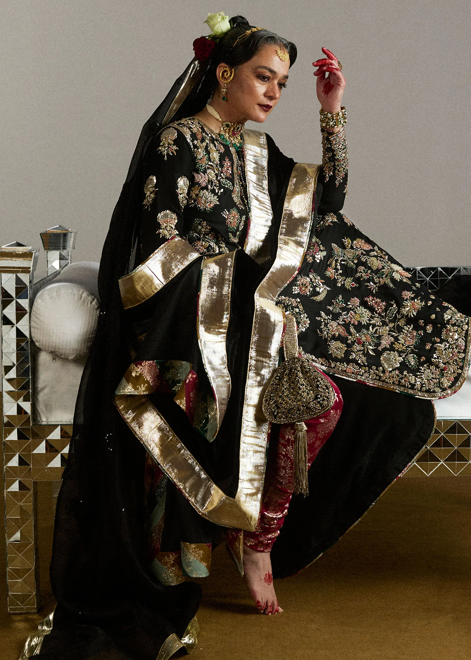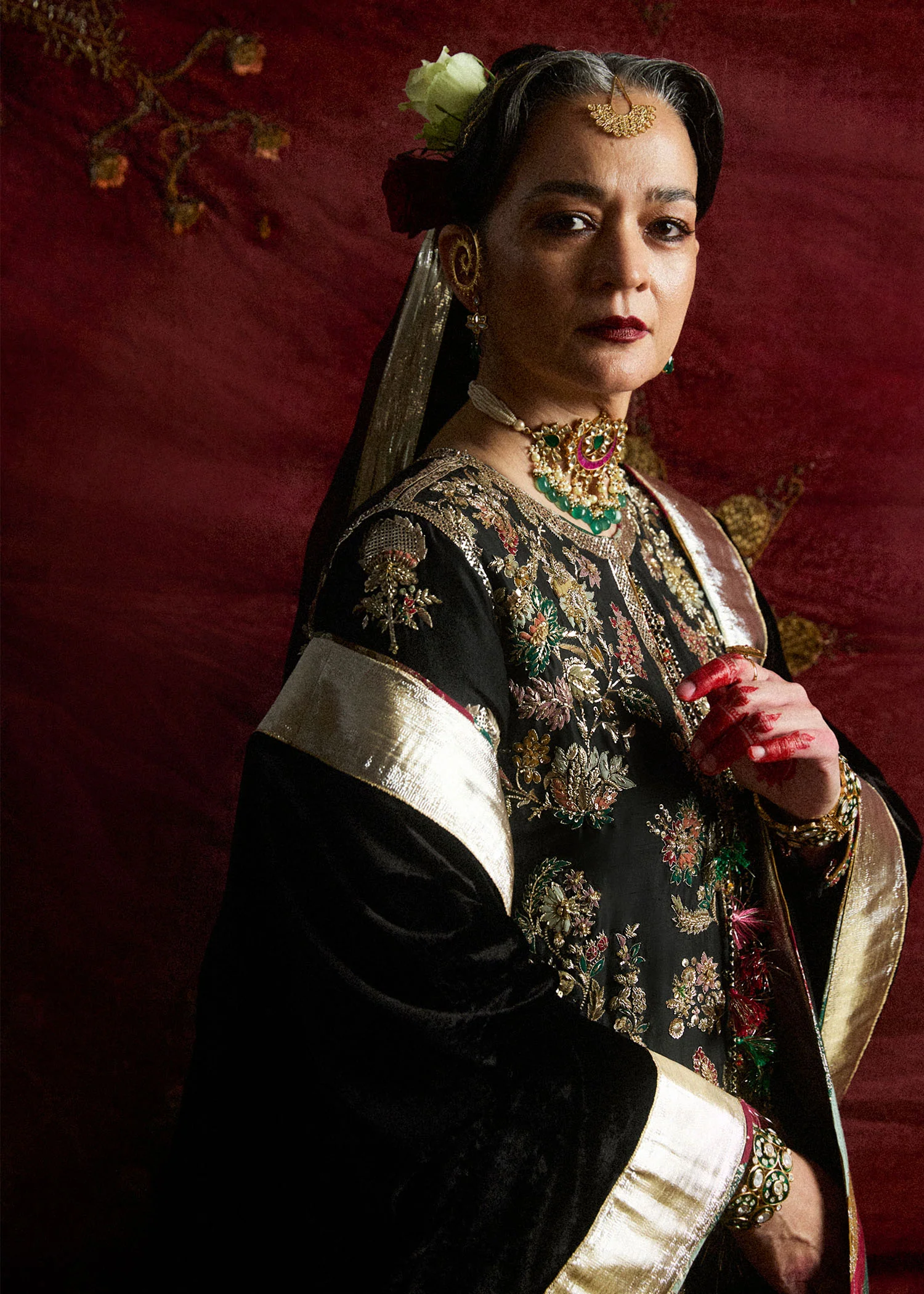 A refined ink black long shirt in raw silk, enriched with multicolor hand embroidery and paired with classic trousers, finished with a luxurious velvet shawl and an embellished organza dupatta.