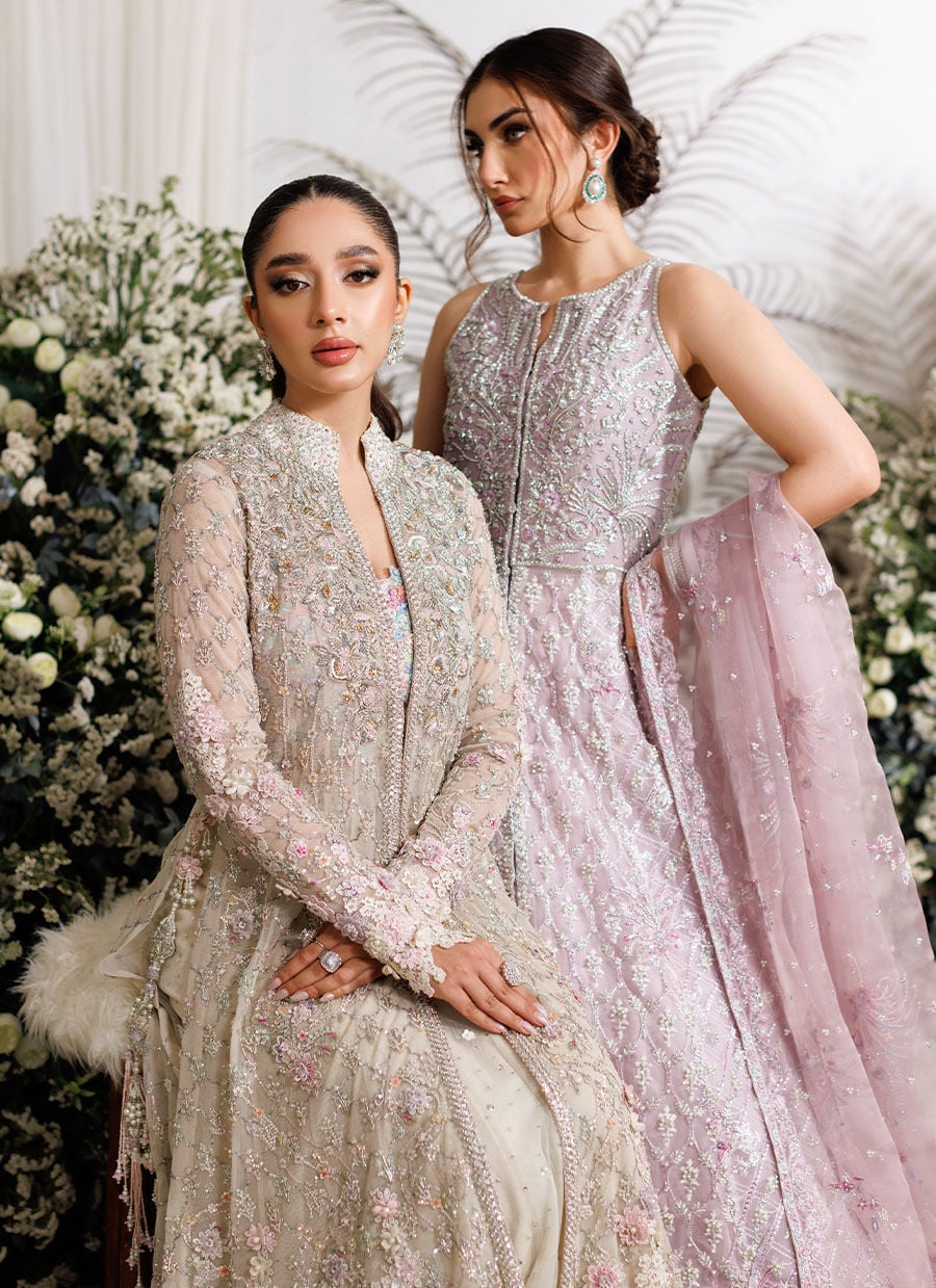 The kalidaar jacket is crafted from pure net in a soft ivory tone, designed to create a light and graceful silhouette. It is adorned with intricate three-dimensional floral handwork, enriched with crystal accents, pearls, sequins, and zardozi detailing. The embellishment forms an artistic trellis pattern featuring florals in delicate lavender, pink, and mint shades, blended using subtle ombre techniques. Geometric appliqué detailing on the bodice adds depth and structure, while handmade tassels flowing along the back and sides bring a touch of movement and elegance.