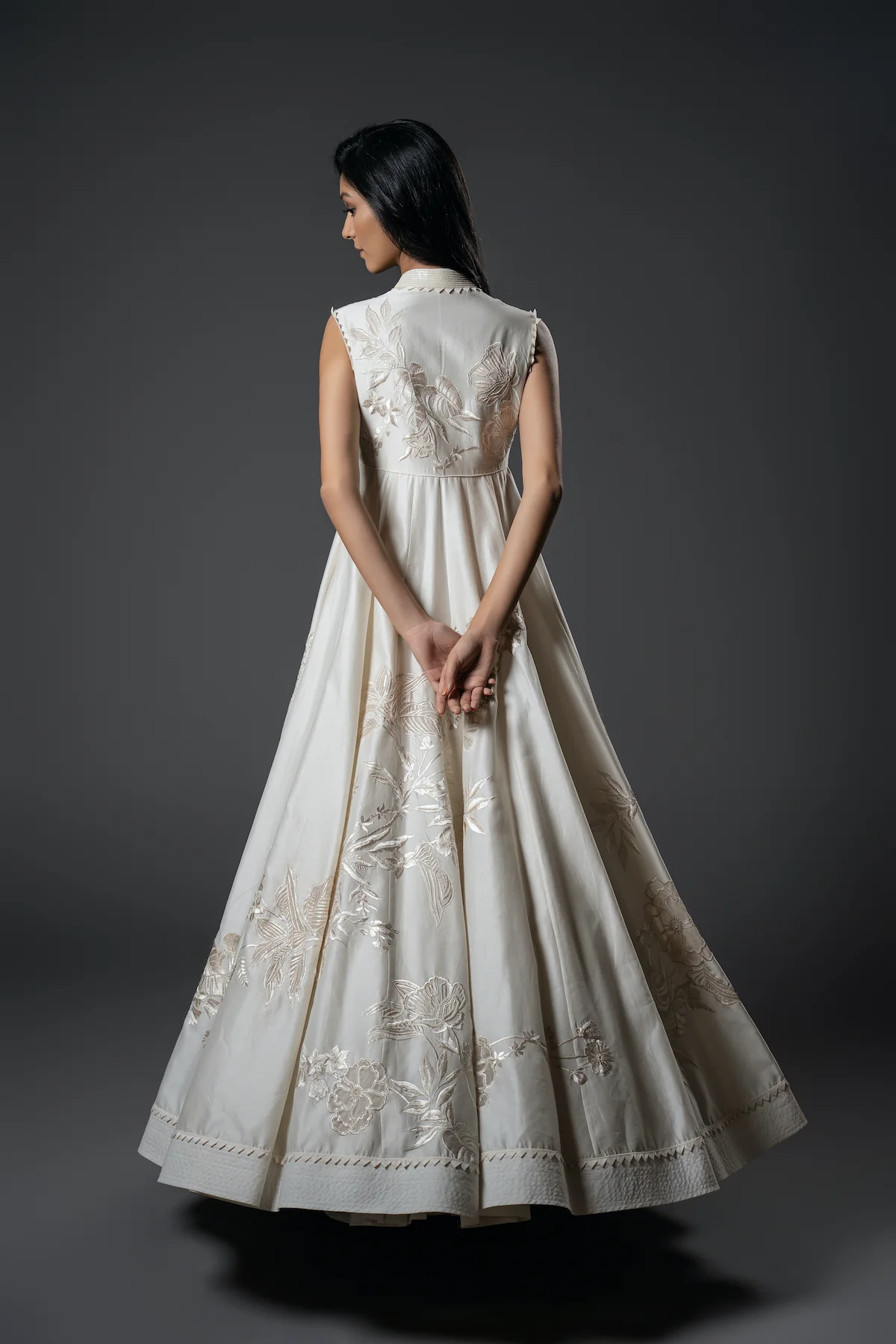 The Anarkali kurta is crafted from refined chanderi silk in a soft ivory shade. It features resham embroidery arranged delicately across the bodice, sleeves, and panels, adding subtle texture and elegance. The silhouette flows gracefully with a structured flare, while the inner lining ensures comfort and ease of movement. The neckline and cuffs are neatly finished, giving the outfit a polished and timeless appeal.