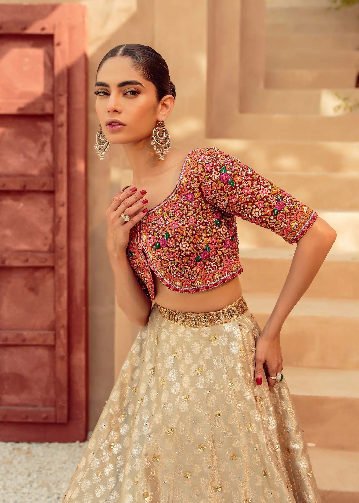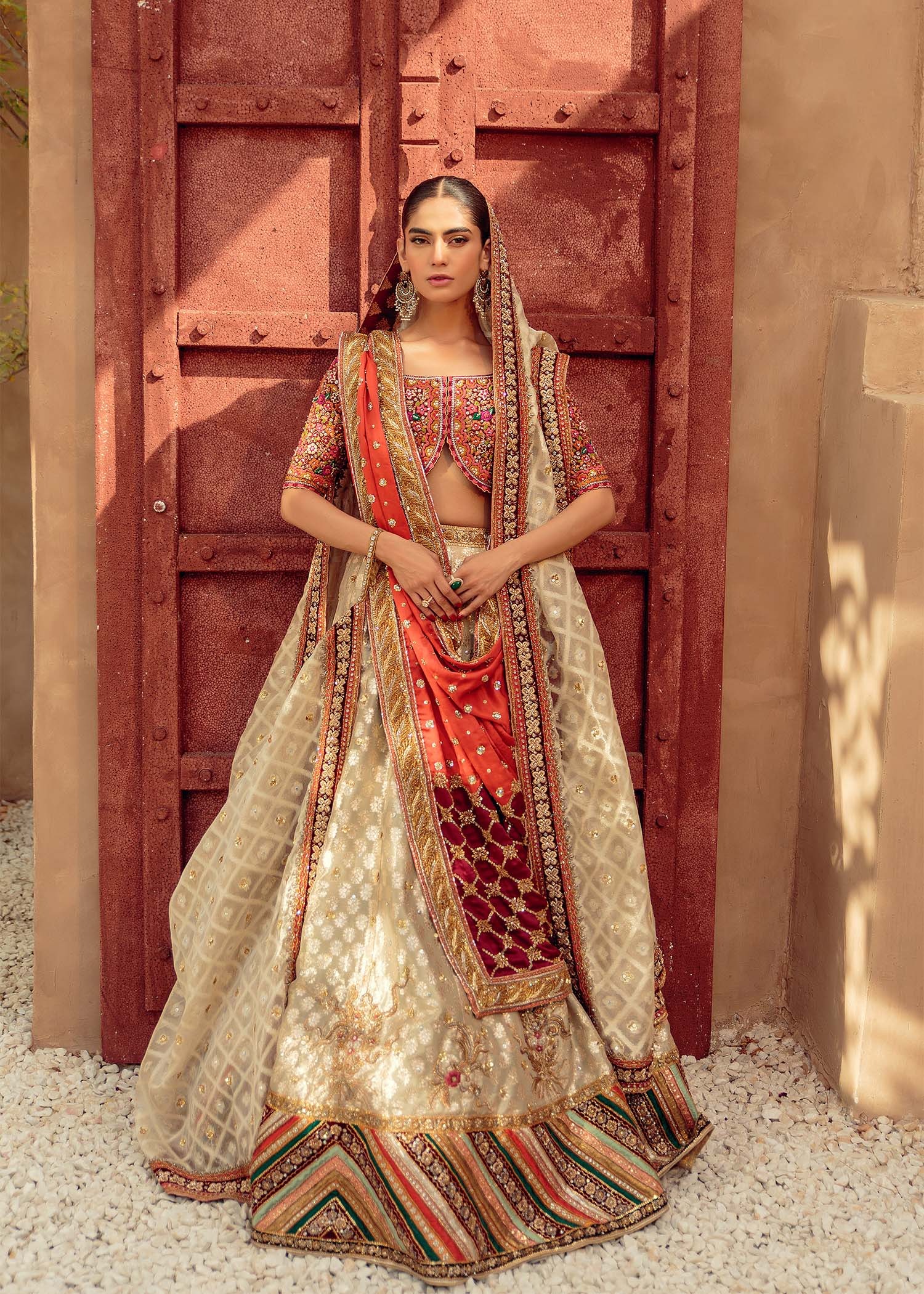 A regal ivory-gold lehenga paired with a richly embroidered choli and a deep crimson dupatta, crafted to embody timeless bridal opulence and cultural grandeur.