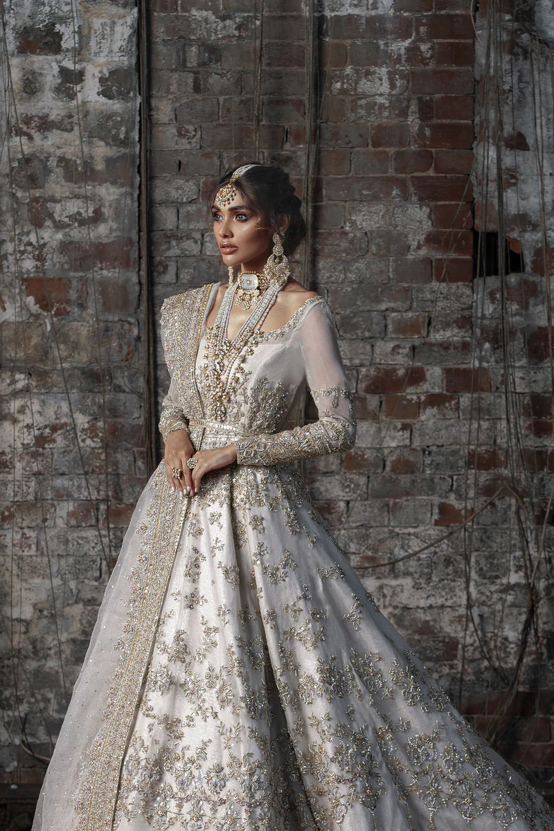 The gown is crafted with an elegant long-tailed silhouette and lined with premium silk brocade for comfort and structure. The hem is fully embellished with exquisite zardozi and sparkling sequins, while delicate motifs are scattered throughout, creating a sophisticated and luxurious bridal or festive statement.
