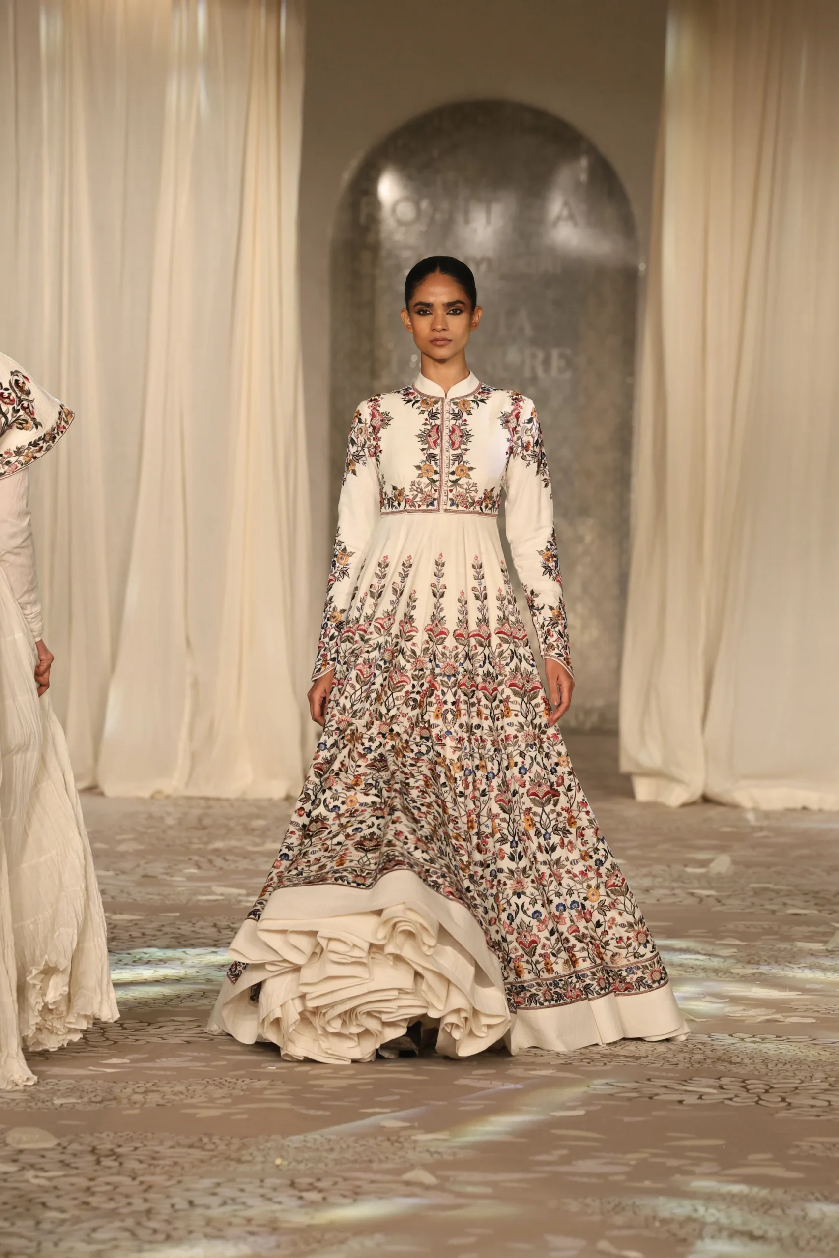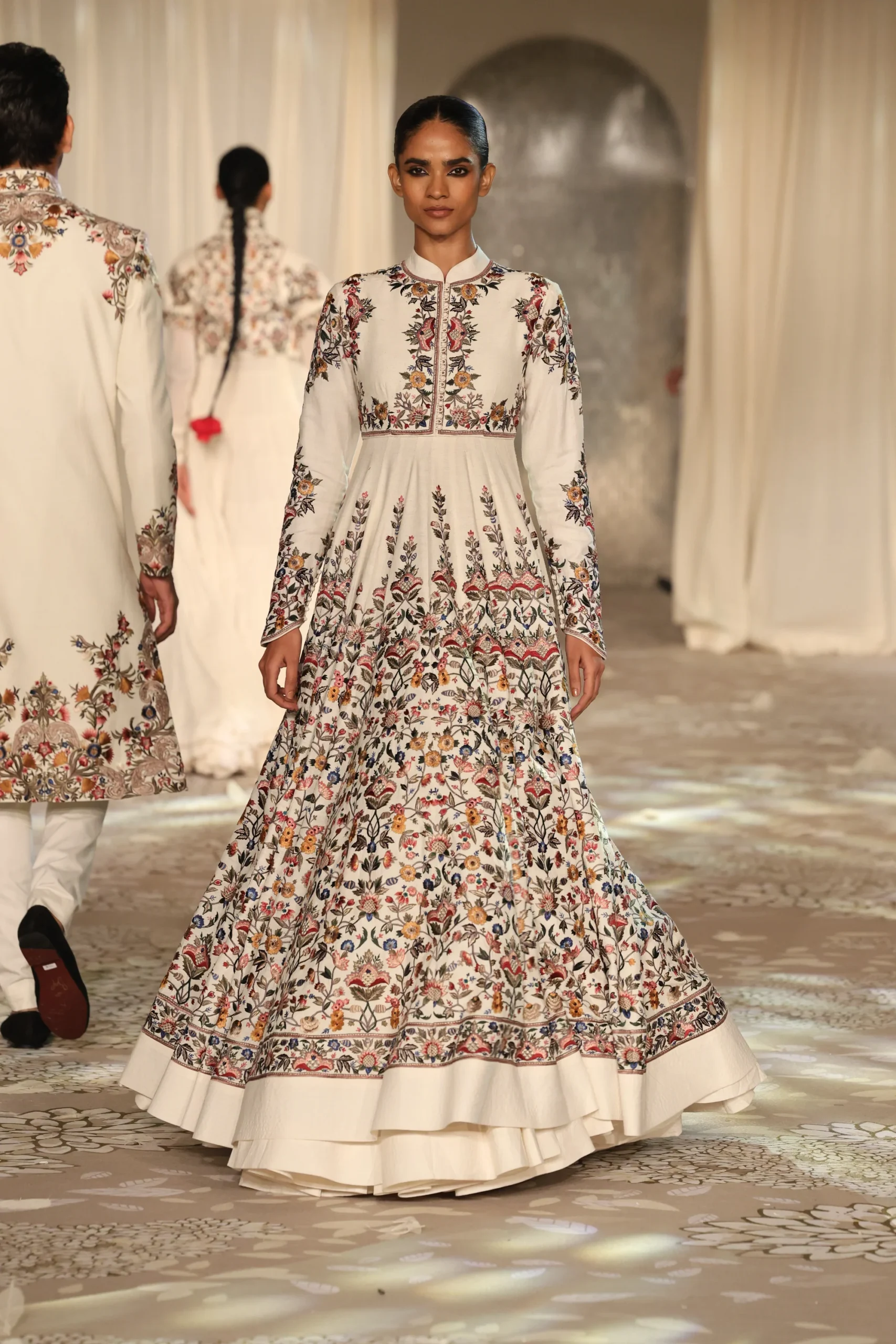 The Anarkali is crafted from matka silk in a serene ivory shade, offering a naturally textured and graceful appearance. Intricate embroidery enhances the neckline, bodice, sleeves, and hem, adding depth while maintaining subtle elegance. A soft inner lining ensures comfort and supports the majestic flare of the silhouette. The clean finishing along the edges further elevates the refined structure.