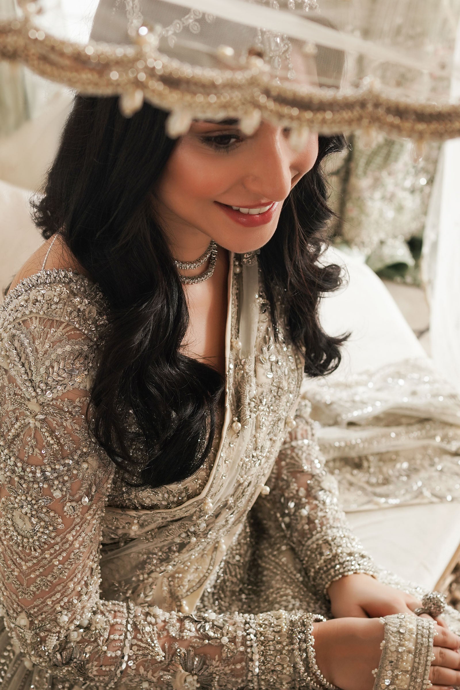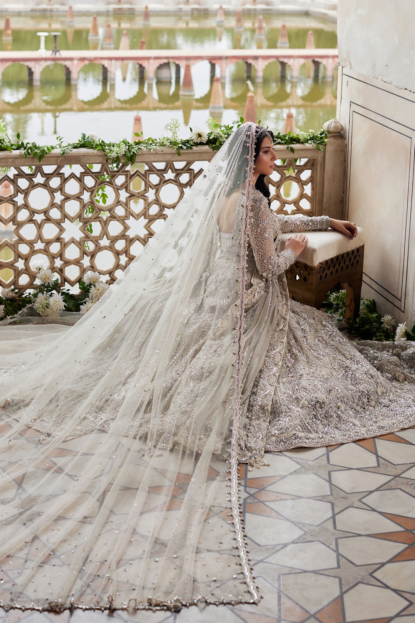 An ethereal maxi masterpiece, Minerva features a flowing ivory silhouette adorned with silver floral filigree, paired with a pearlescent sharara and an intricately embellished net dupatta for regal elegance.