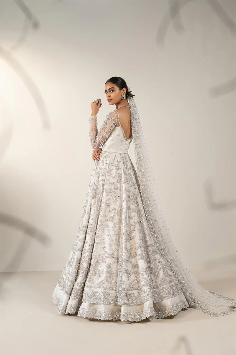 An ivory bridal-inspired lehenga set featuring a mirror-detailed embroidered net dupatta, hand-embellished organza lehenga, and silk brocade blouse for an elegant and timeless festive look.
