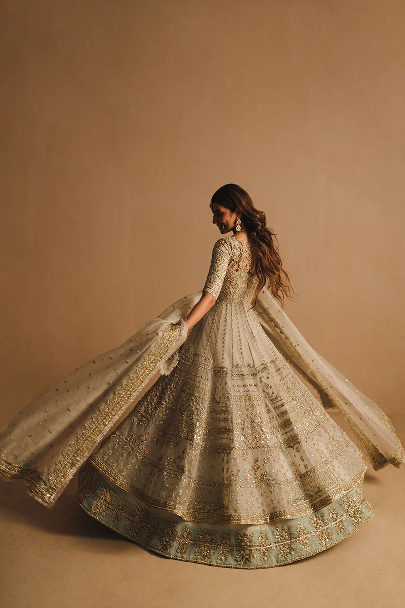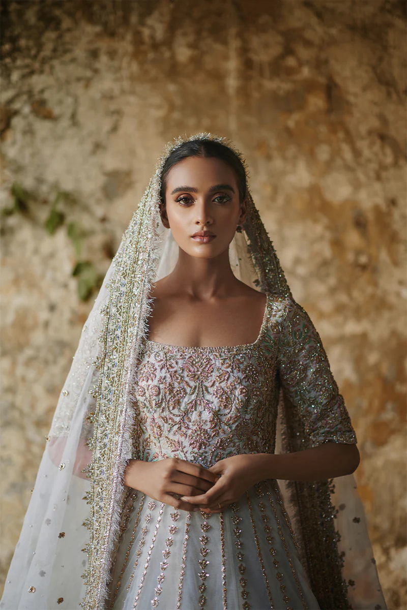 Linear and geometric embellishments enriched with pastel embroidery, zardozi detailing, pearl accents, and delicate motif work applied with precision.