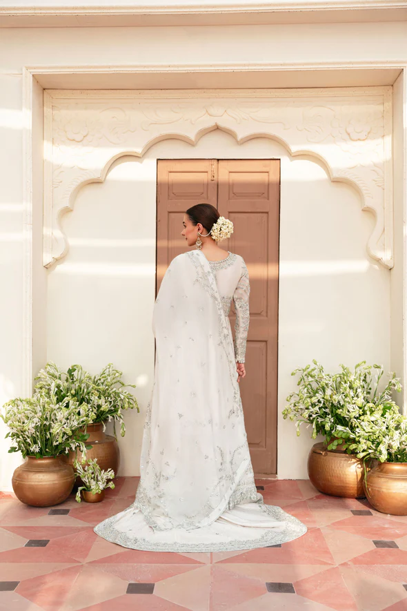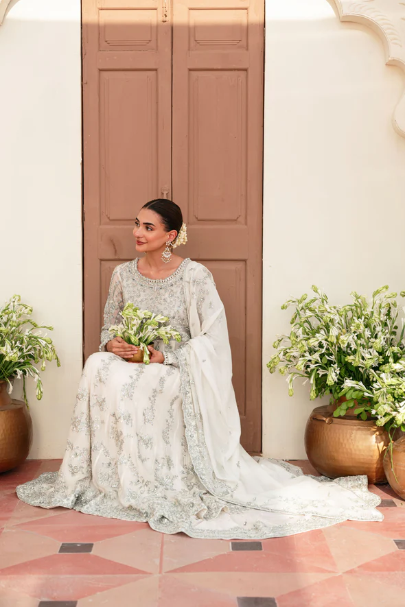 A breathtaking ivory bridal kalidaar crafted from soft tissue net, adorned with intricate silver ada work and paired with an exquisitely detailed dupatta, designed for an elegant and contemporary bridal presence.
