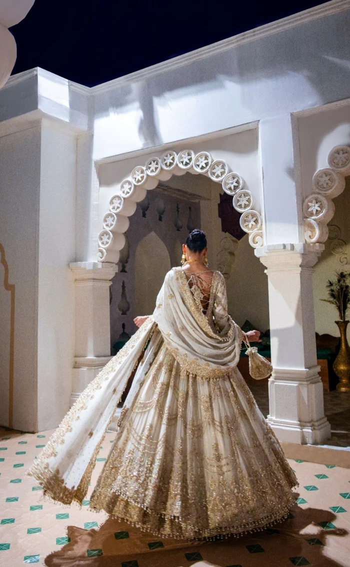 The ensemble is completed with a dramatic 4-yard long dupatta that adds an ethereal charm. Light and fluid in movement, the dupatta features hand-worked borders and delicate embroidery that echoes the jewelled detailing of the dress. Its generous length enhances the overall grandeur while preserving softness and grace.
