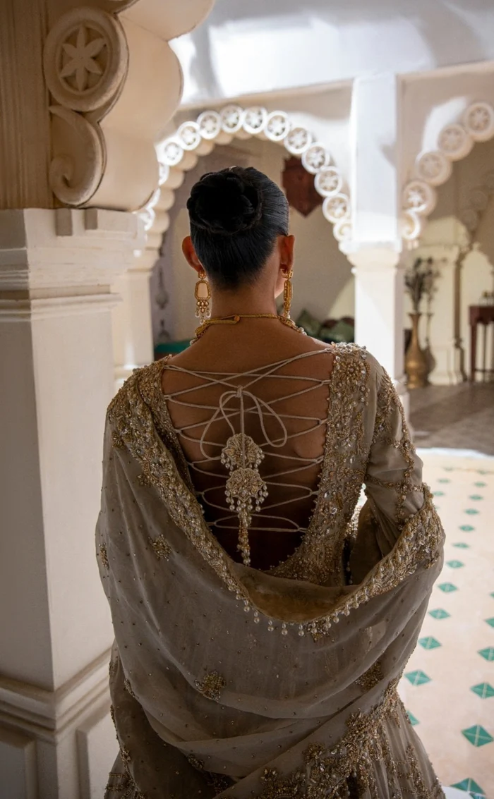 Premium traditional fabrics are used throughout the outfit, selected for their luxurious feel and ability to hold intricate hand embroidery with finesse.