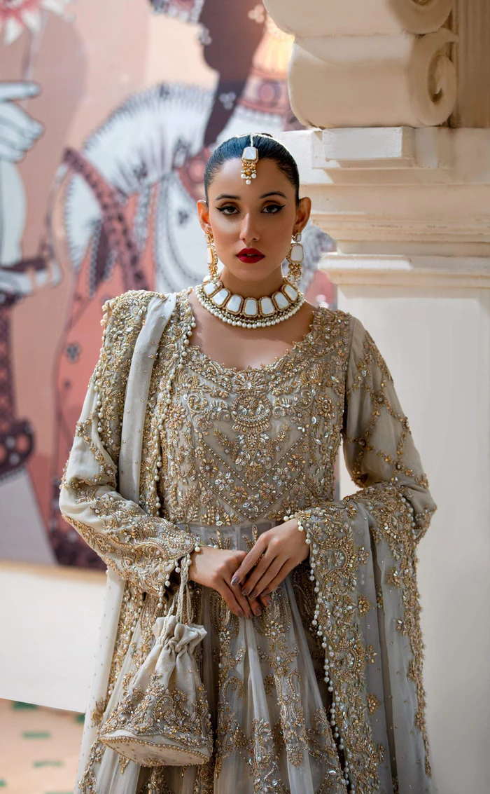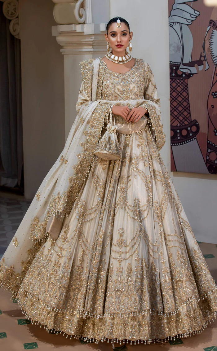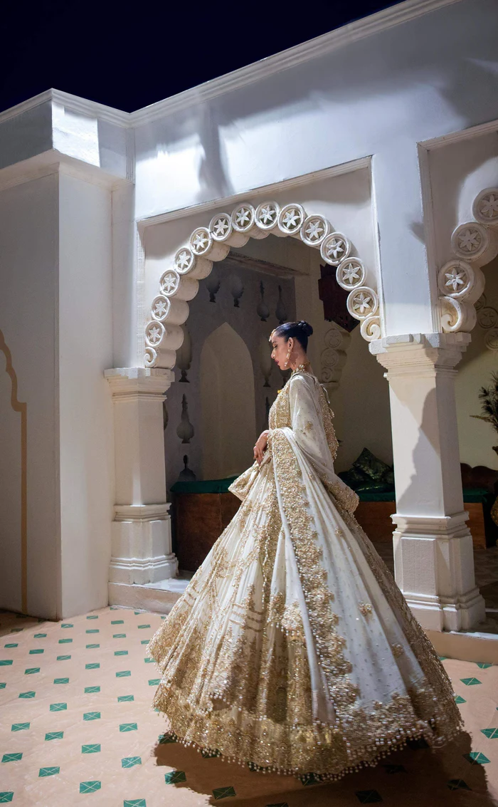 A breathtaking ivory ensemble adorned with intricate tilla and dabka embroidery, finished with a flowing 4-yard dupatta for an effortlessly regal look.