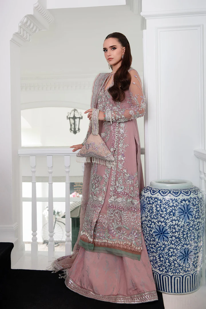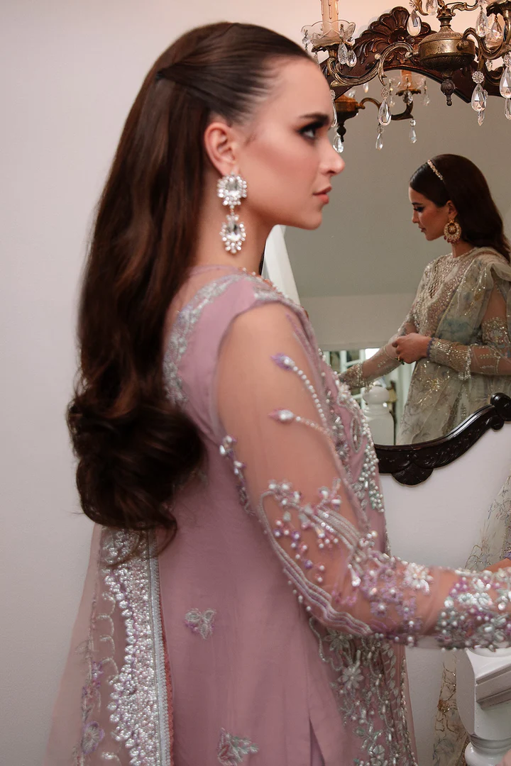 This elegant kameez is crafted from premium chiffon fabric and designed to exude sophistication and charm. It is adorned with intricate hand-embellished sequins and floral motifs that bring a glamorous shimmer to the outfit. Detailed embroidery, dabka work, and silver accents complete the design, giving the kameez a refined and polished finish. The overall silhouette combines traditional elegance with contemporary style, making it an ideal choice for weddings and formal celebrations.
