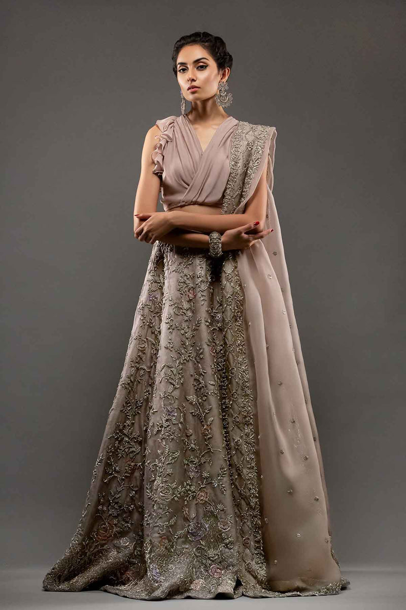 The Laila Wedding Dress is a graceful bridal ensemble featuring a fully embellished lehenga with floral zardozi artistry, paired with a delicate silk organza choli with ruffle sleeves and an ethereal organza net dupatta. Designed for brides who seek romance, refinement, and timeless craftsmanship.