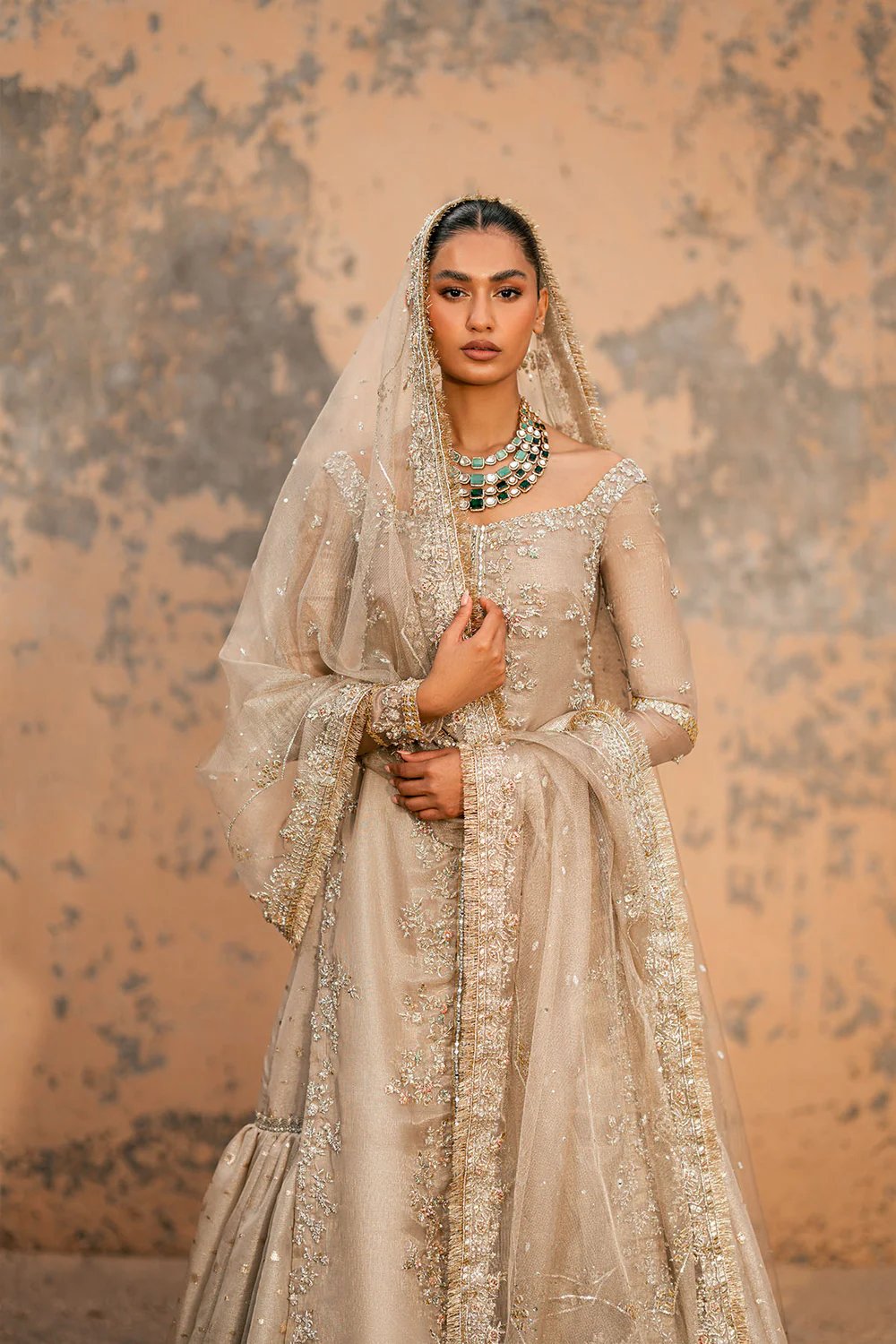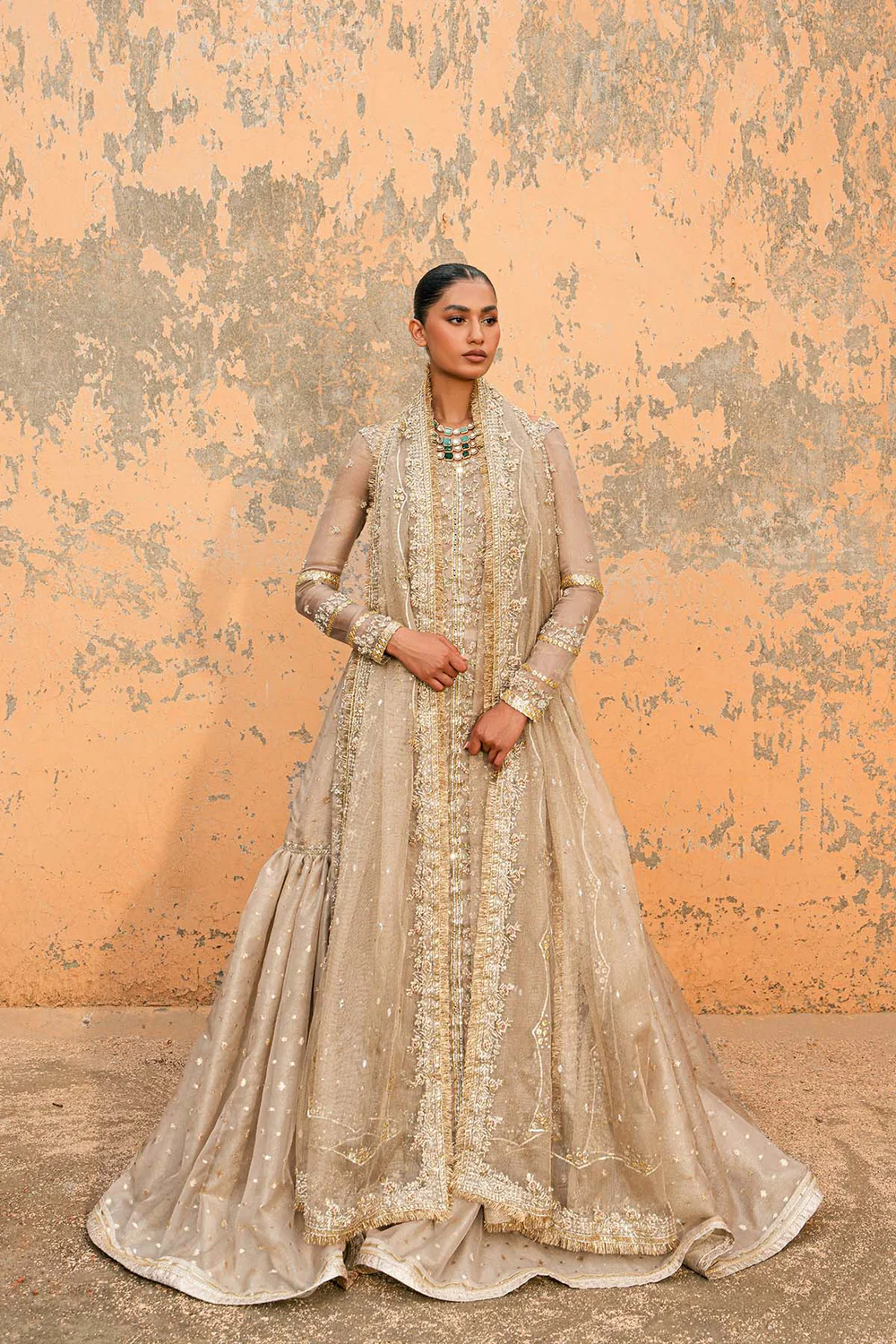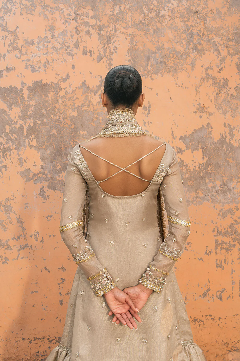 A metallic taupe shirt with intricate pastel embroidery and mirror details, paired with a flared organza zari gharara and a heavily embellished zari net dupatta for a statement-making traditional look.