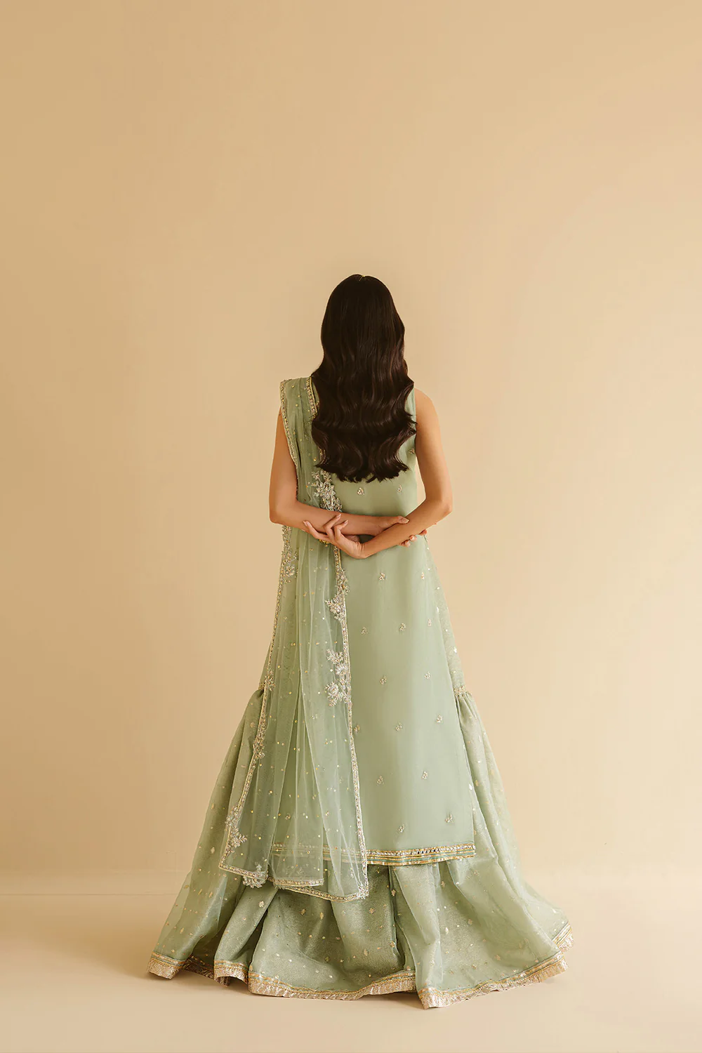 A beautifully handcrafted sea foam green gharara set with metallic and pastel embroidery, mirror and gotta detailing on the shirt, paired with an embellished net dupatta for a sophisticated festive or wedding look.