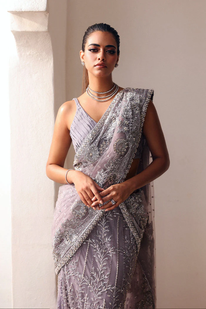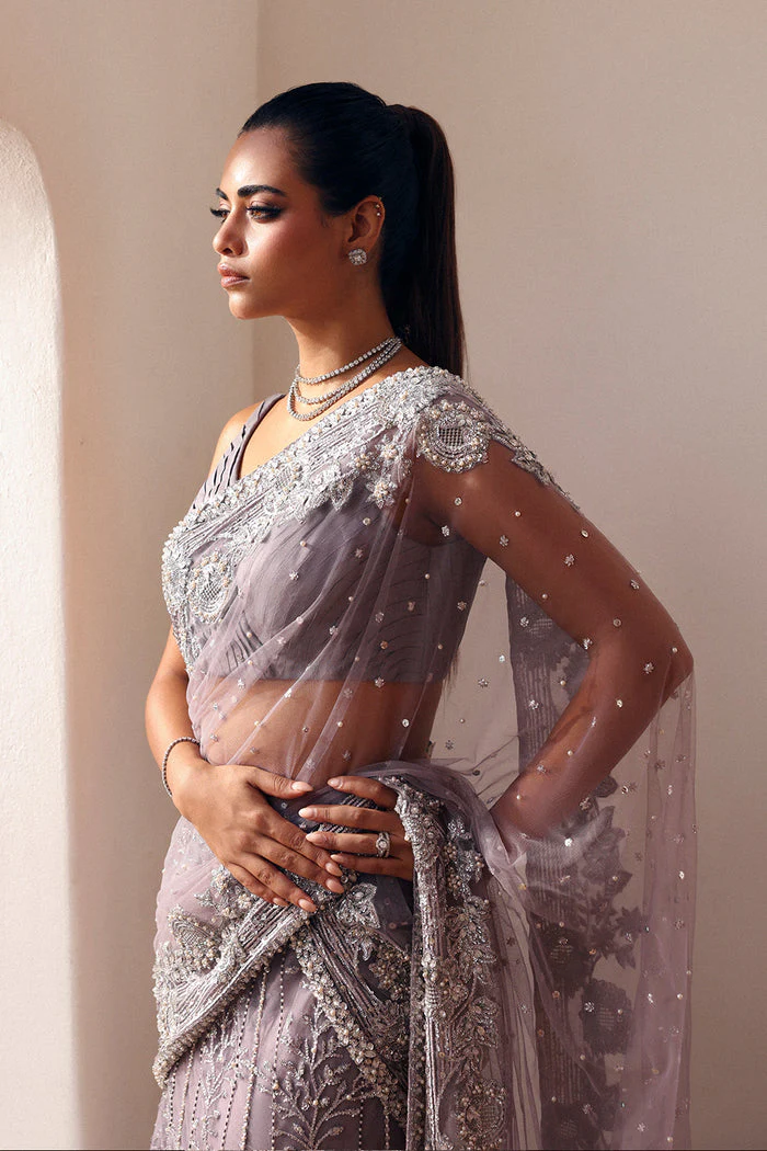 An enchanting lilac bridal saree and blouse set, richly adorned with silver embellishments, Swarovski accents, and intricate detailing—crafted to create a truly unforgettable wedding look.