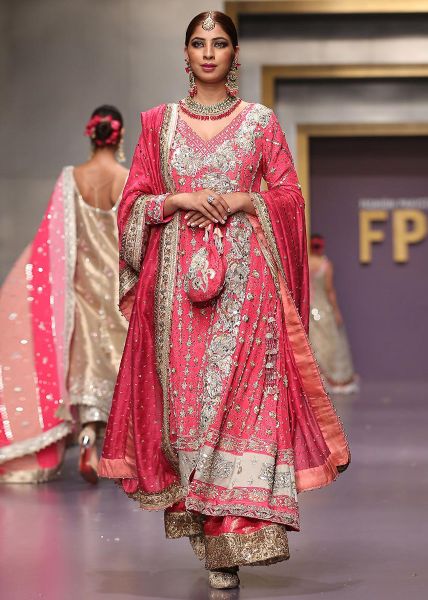 A luxurious magenta outfit crafted with charmeuse, chundari, banarsi, and khaddi net, adorned with silver kora, dabka, kamdani, and digital print borders.