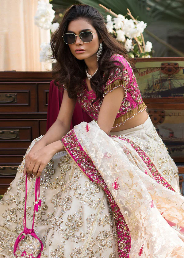 The optional second dupatta is crafted from organza and features a fully worked four-sided border. Its lightweight structure makes it perfect for bridal layering, adding versatility to the overall look.