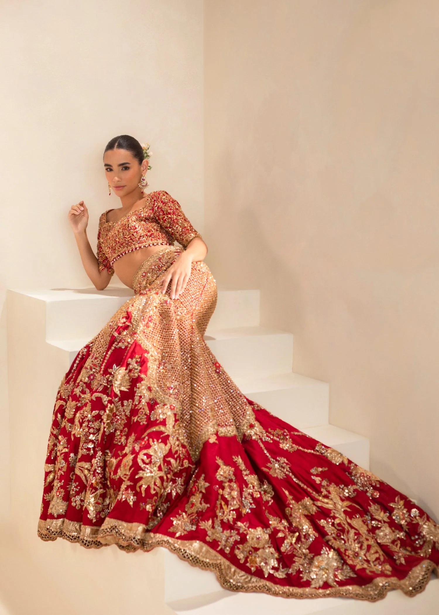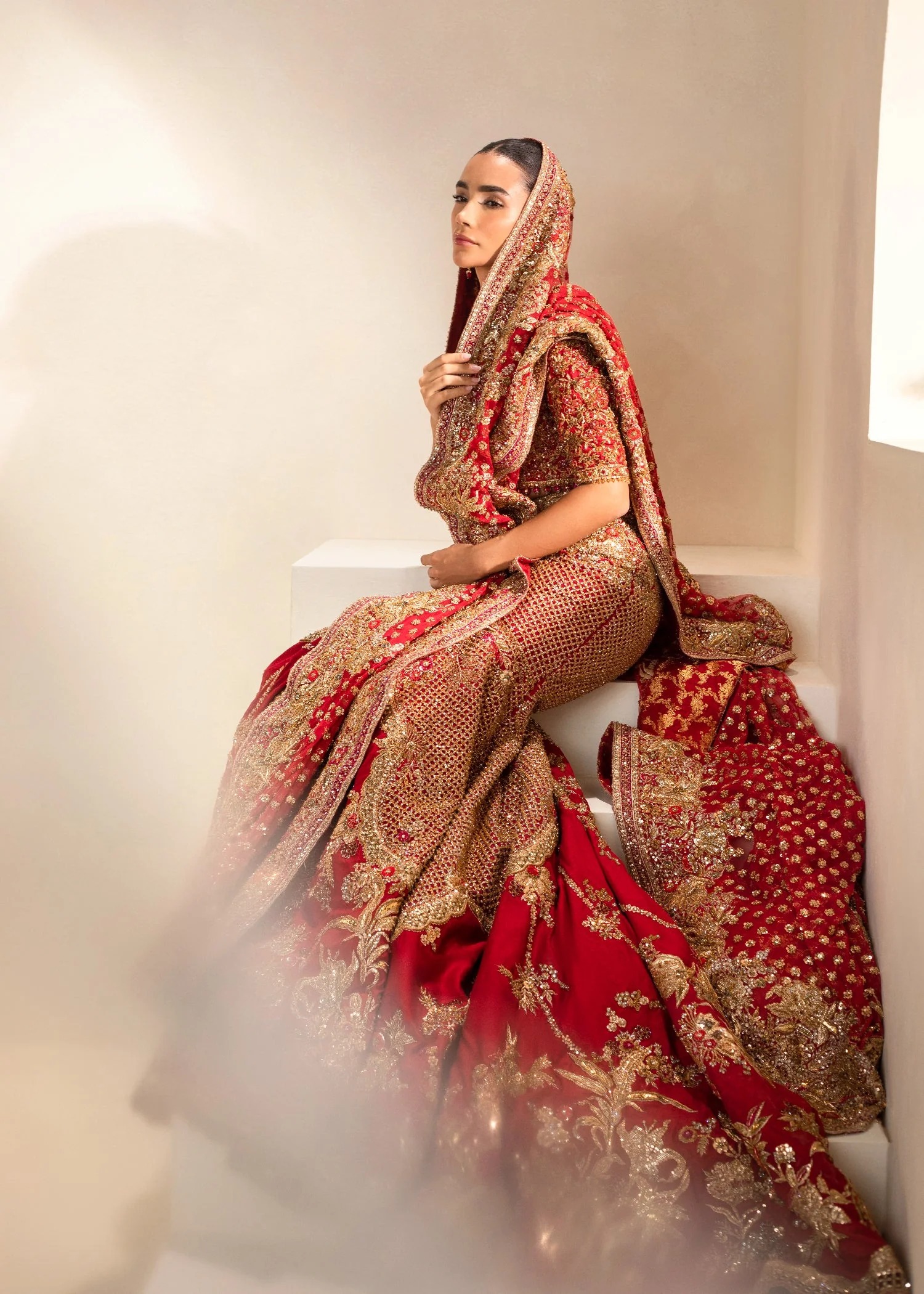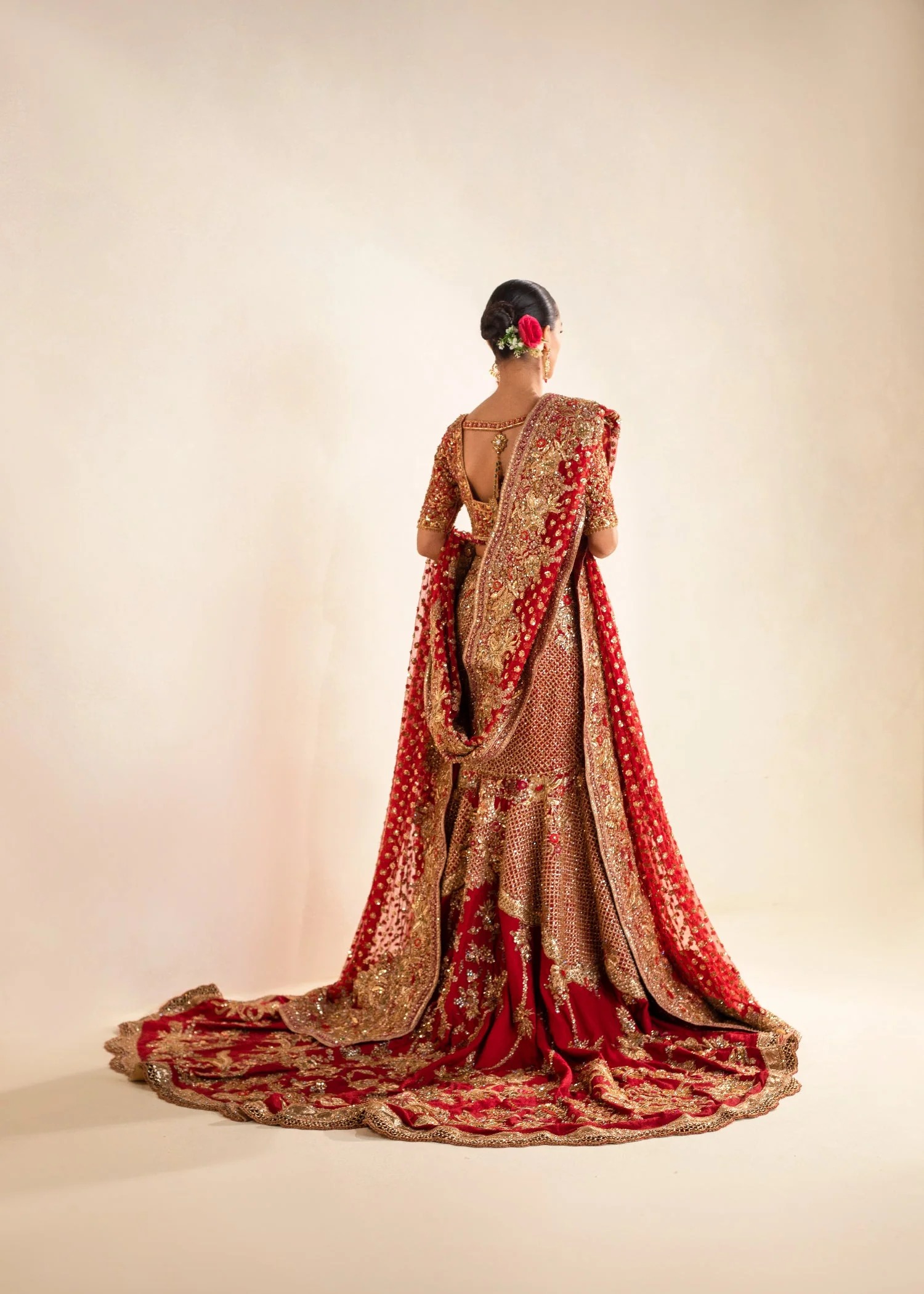Completely handcrafted using sequins, beads, Swarovski crystals, cut-glass touches, kora, naqshi, and tilla embroidery. Slight artisanal variations may appear, affirming the authenticity of hand embellishment.