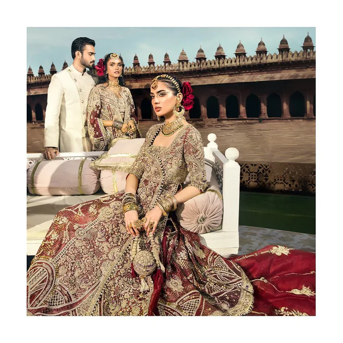 The ensemble is complemented with a sheer tissue dupatta, adding an elegant finishing touch. For a more traditional appearance, custom dupattas are available to match your style preferences, enhancing the overall bridal elegance.