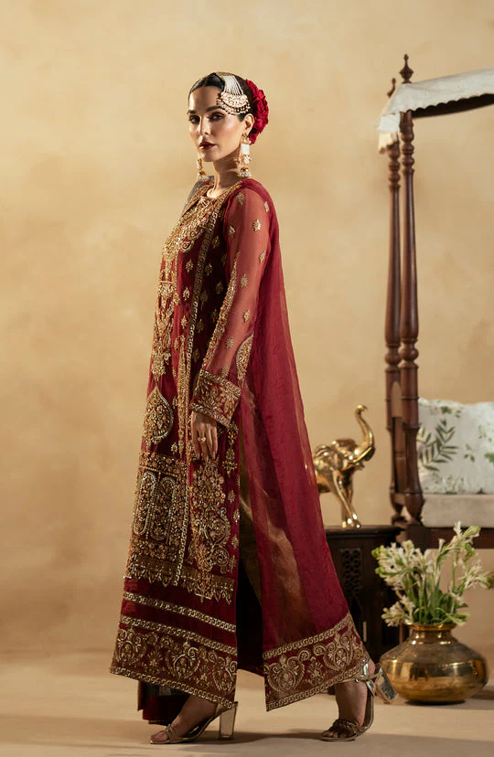 A luxurious maroon Pakistani kameez adorned with intricate zardosi, tilla, and beadwork, paired with flared trousers and a delicately embellished net dupatta for a stunning wedding ensemble.