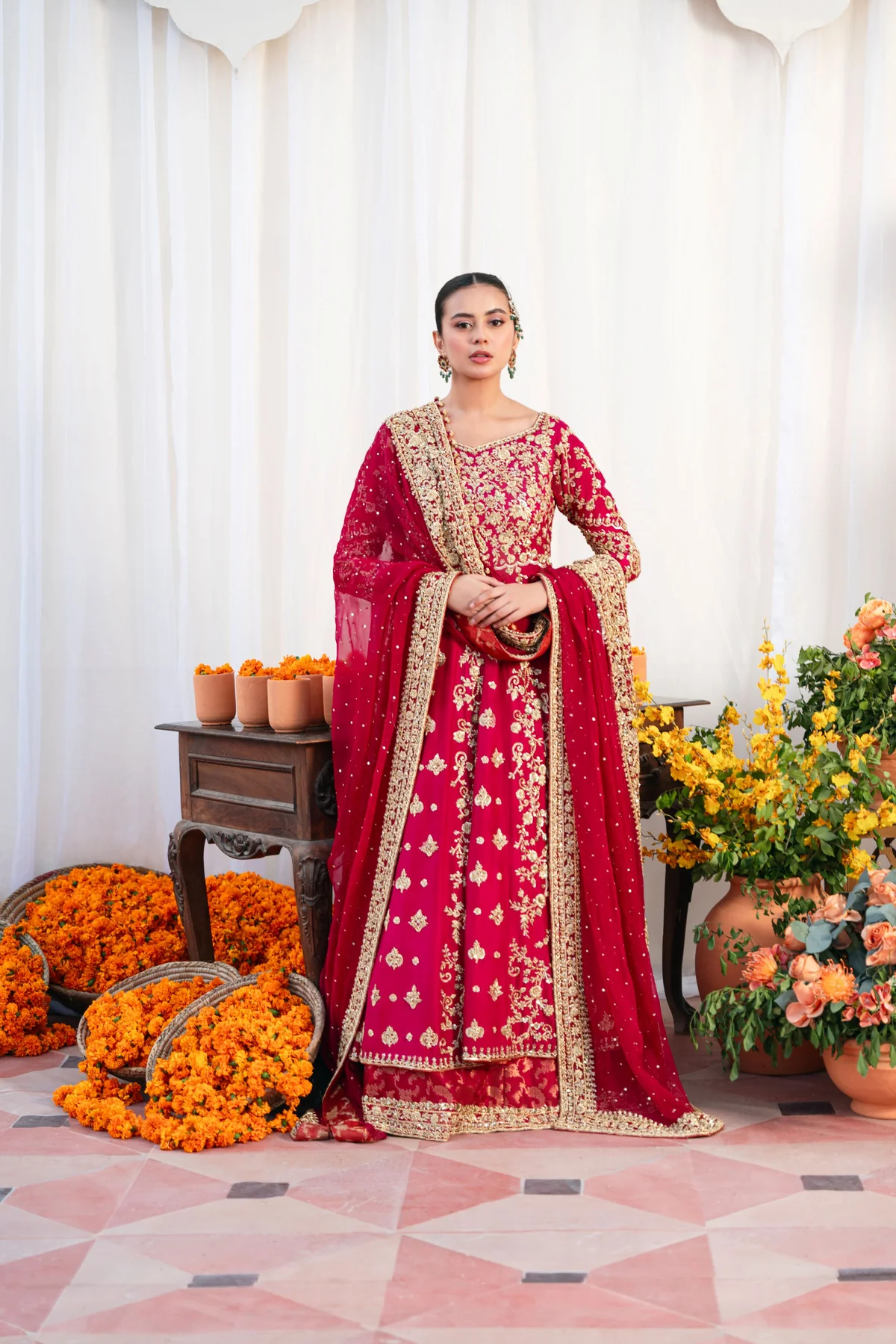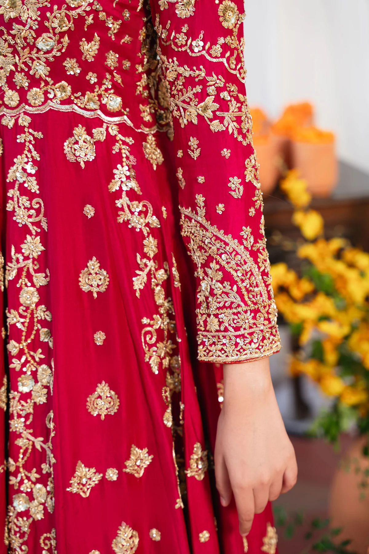 A majestic maroon bridal kalidaar crafted from pure raw silk and enriched with gold hand ada work, paired with a statement dupatta and jamawar panelled skirt for a contemporary bridal look.