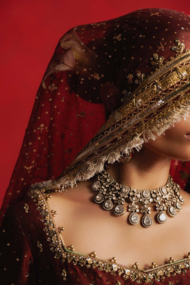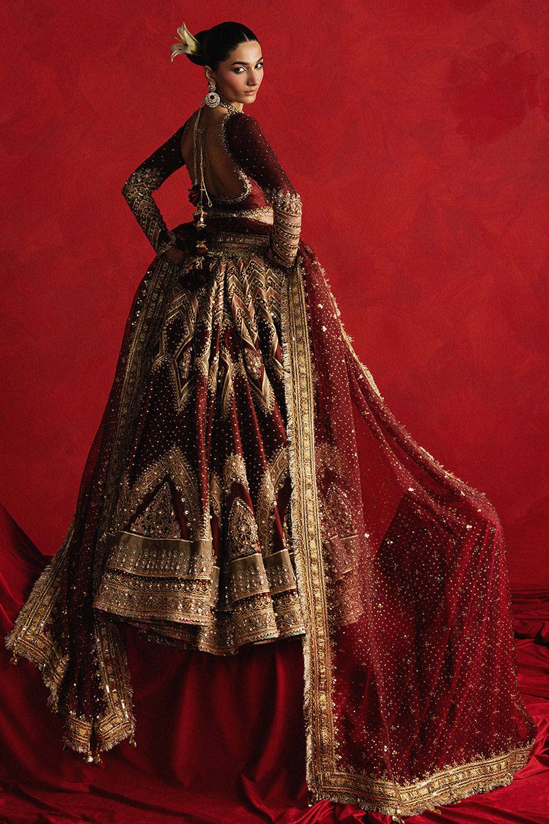 A commanding three-piece bridal ensemble in deep maroon, featuring architectural embroidery, heritage motifs, and rich hand embellishment designed for a powerful and regal bridal presence.