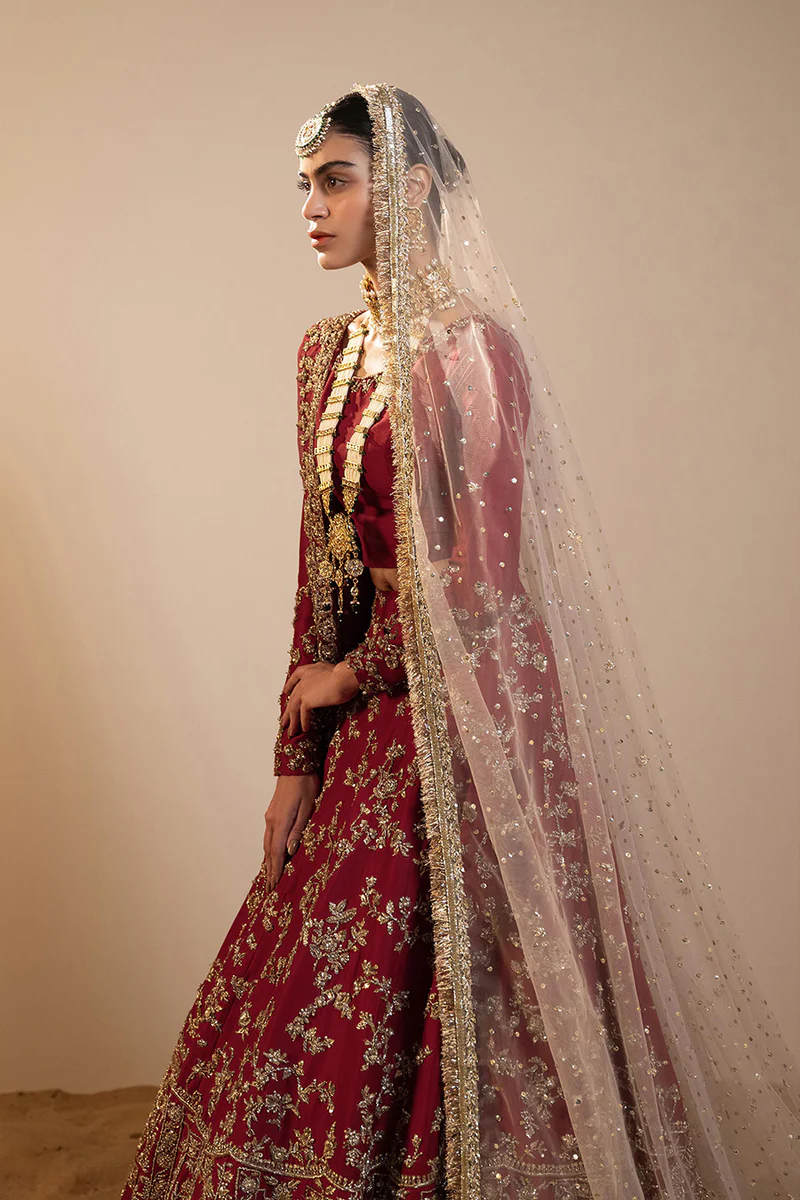 A regal handcrafted maroon ensemble featuring intricate floral and geometric zardozi and mokaish work on rich raw silk, paired with a flowing lehenga, sheer organza dupatta, and an ethereal net veil for timeless bridal elegance.