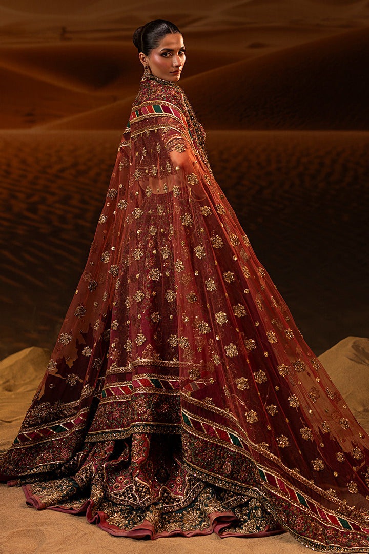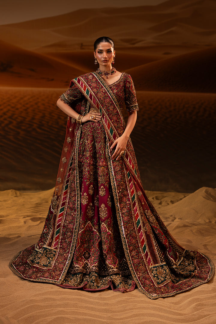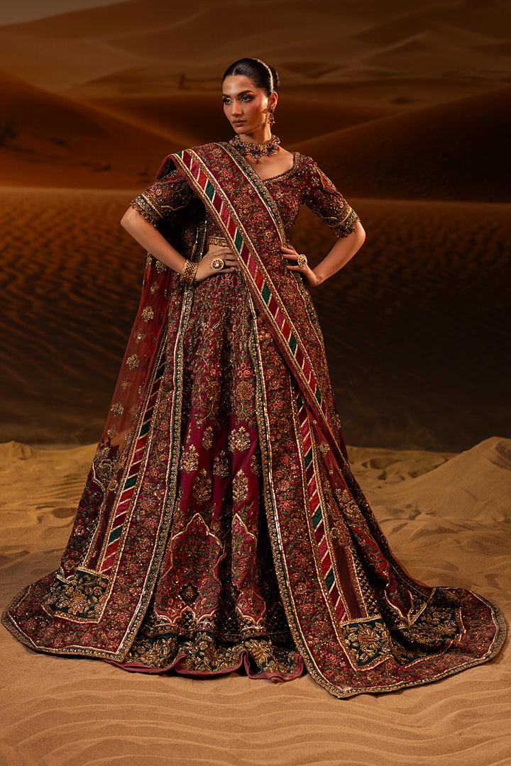 A timeless maroon lehenga choli enriched with terracotta red and deep green accents, Rang-e-Sultanat celebrates regal tradition through intricate zardozi, gota, and sequin craftsmanship.