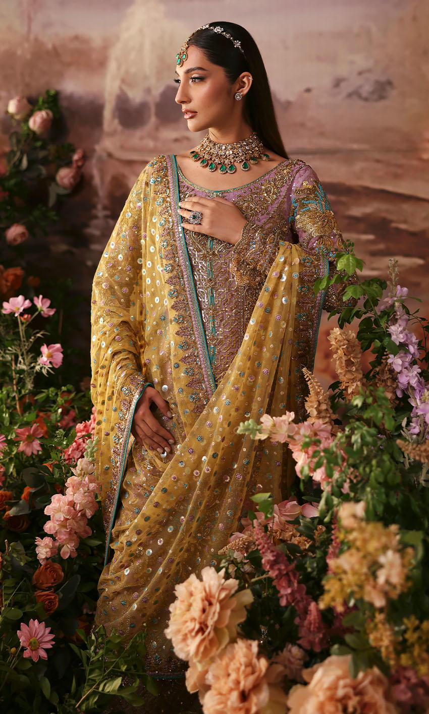 The net dupatta is designed in a contrasting shade, embellished delicately along the borders and lightly scattered with handwork for a striking finish. The contrast adds vibrance, tying the entire outfit together effortlessly.