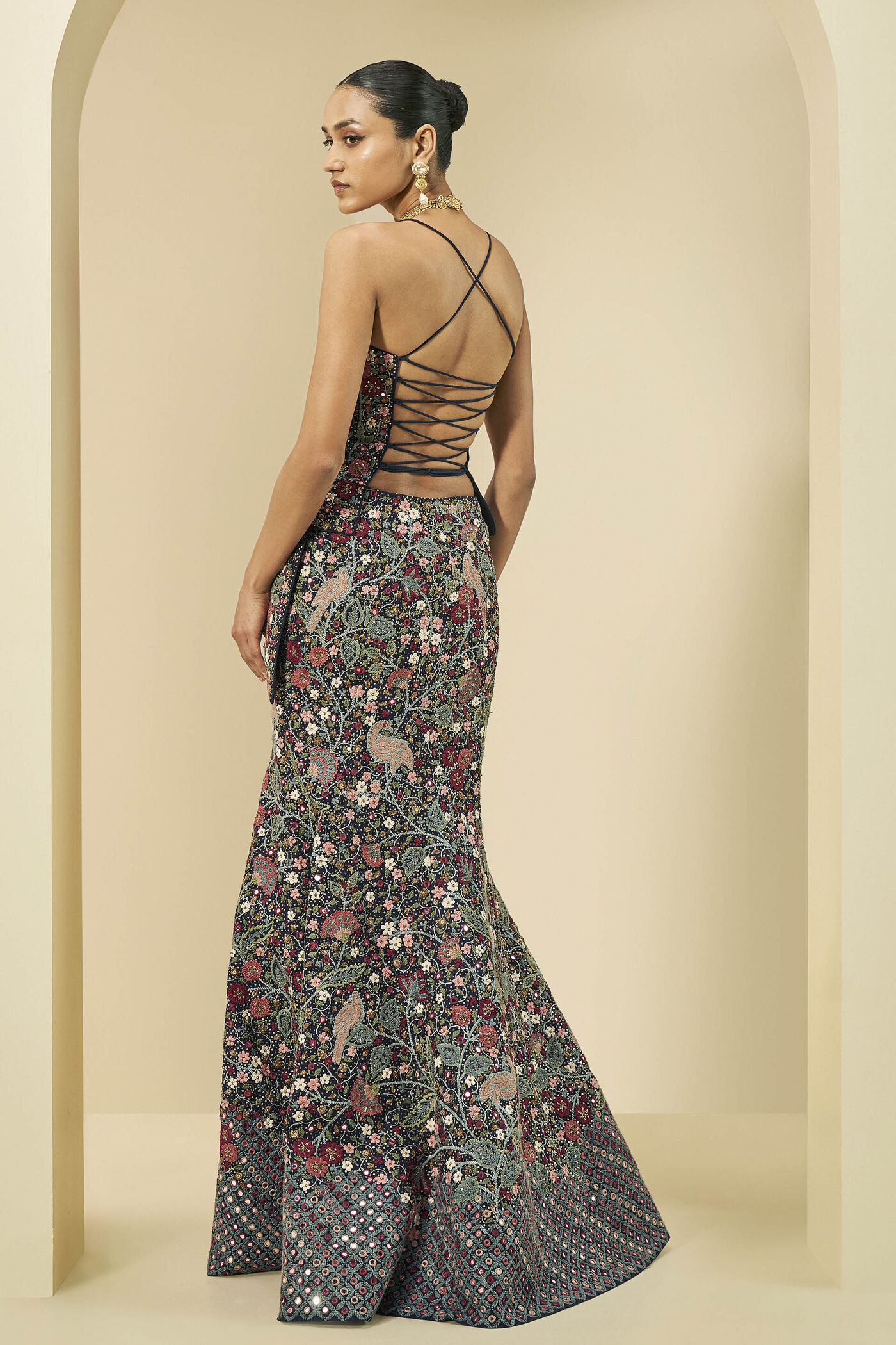 The skirt is rendered in a matching navy fabric, tailored in a refined column silhouette that flows elegantly to the floor. It continues the ornate botanical theme, showcasing large-scale floral motifs and gracefully perched bird patterns in shades of rose, sage, and ivory. The hem is finished with a distinct geometric border featuring micro-mirror work or metallic sequins, providing a structured weight to the drape. A discreet side zip ensures a seamless and flattering fit.