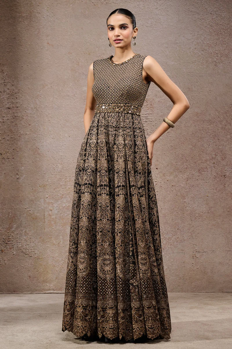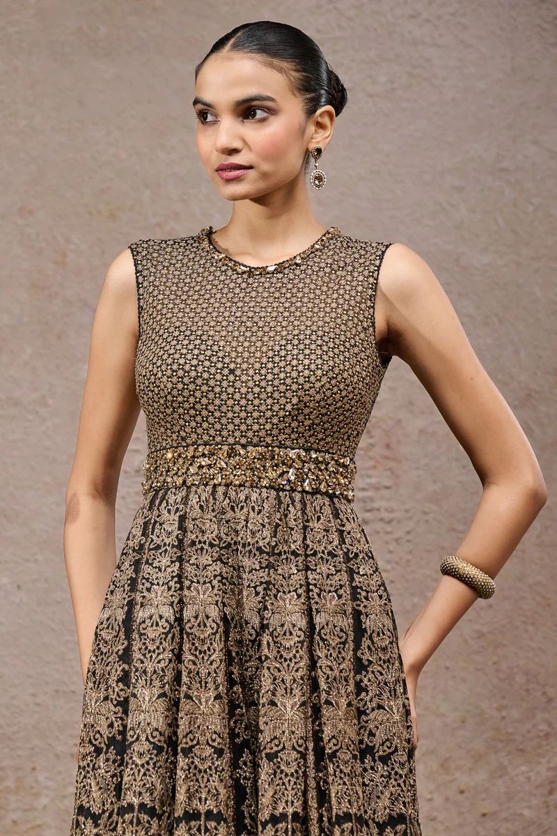 A majestic sleeveless Anarkali gown in a deep charcoal base, featuring a stunning contrast of bronze-gold embroidery and a cinched embellished waist for a regal, evening-ready silhouette.