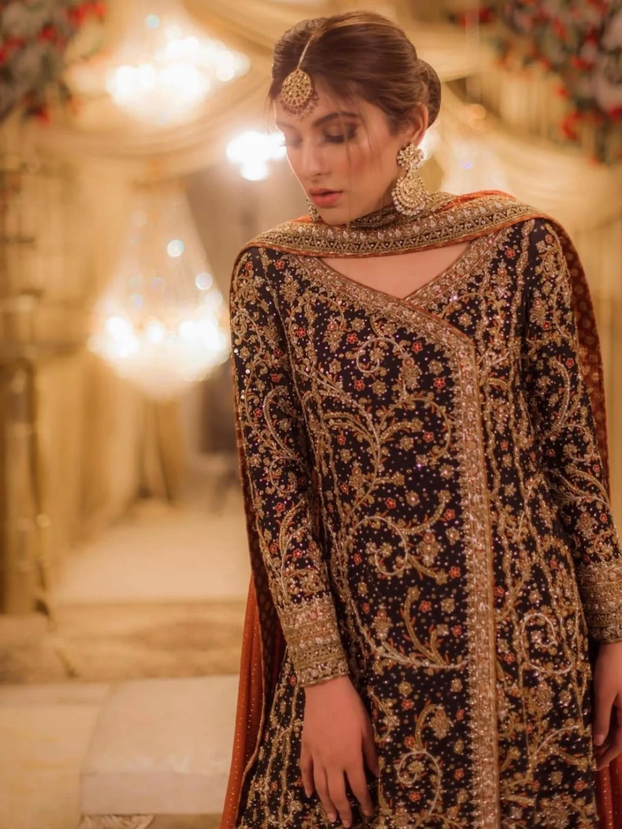 A richly detailed black and gold formal outfit featuring intricate hand embroidery, paired with a complementing dupatta for an opulent wedding or festive look.
