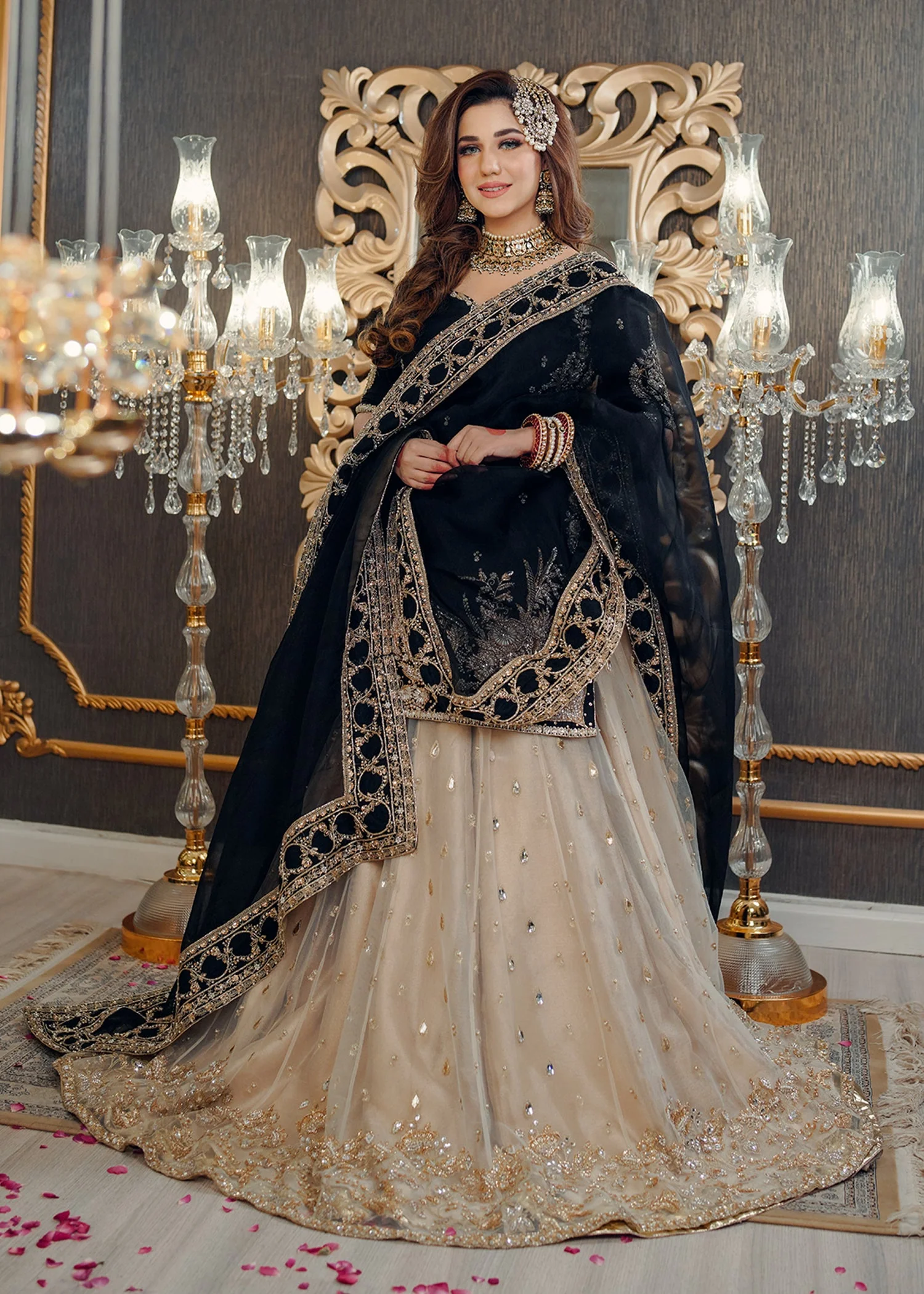 A striking black and ivory bridal ensemble featuring a hand-worked raw silk shirt, crystal-kissed net lehnga, and an organza dupatta bordered with pearls and gold—crafted for a look that is elegant, artistic, and effortlessly memorable.