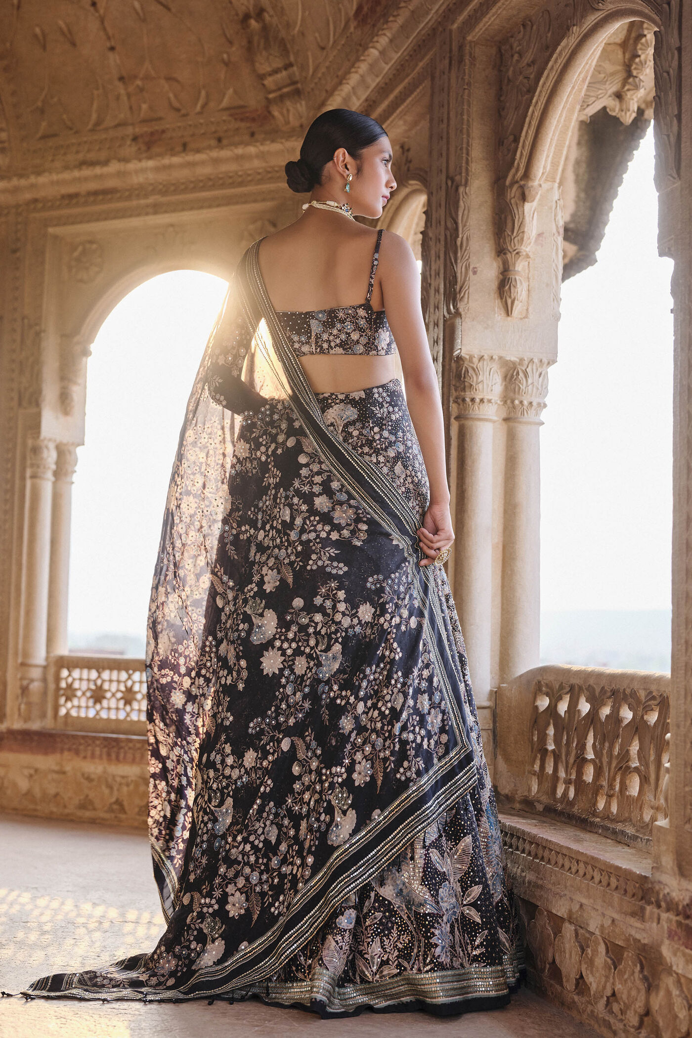 The dupatta is fashioned from a sheer, lightweight midnight-black fabric, designed to drape elegantly over the shoulders. It is bordered with detailed metallic embroidery and a linear gold-silver trim that echoes the hem of the lehenga. Delicate floral motifs and a soft dusting of sequins are placed throughout the veil, catching the light with every movement while maintaining a mysterious and sophisticated allure.