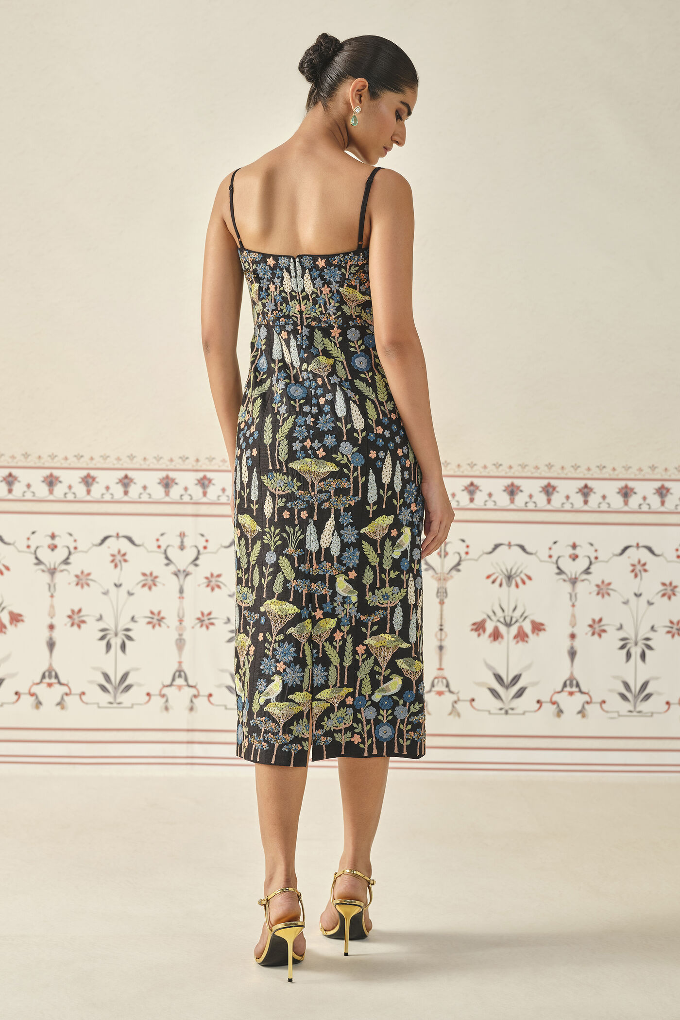 A sophisticated fusion of classic tailoring and whimsical artistry, this midnight black midi dress features a structured sweetheart bodice and a sleek silhouette meticulously adorned with a vibrant tapestry of hand-embroidered avian and forest motifs.