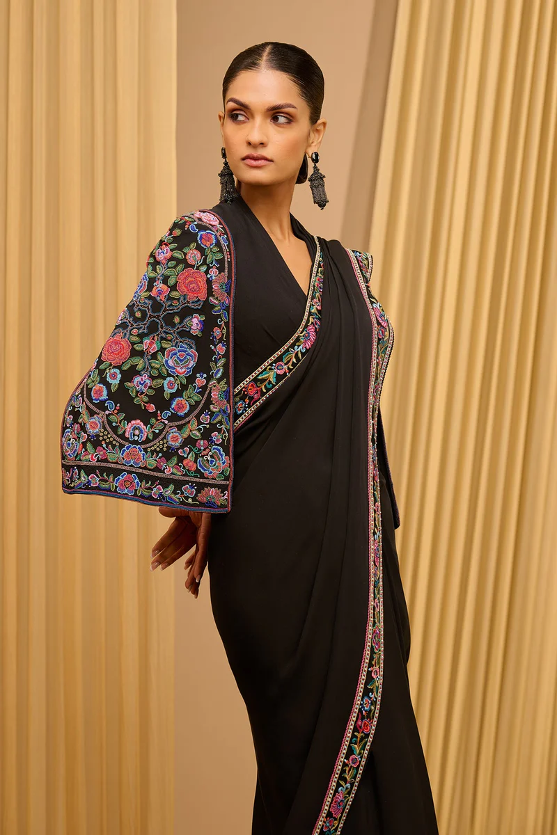 A sophisticated midnight black saree featuring a contemporary V-neck blouse and a striking cape-style jacket, intricately adorned with vibrant multi-colored floral embroidery and a matching delicate border.