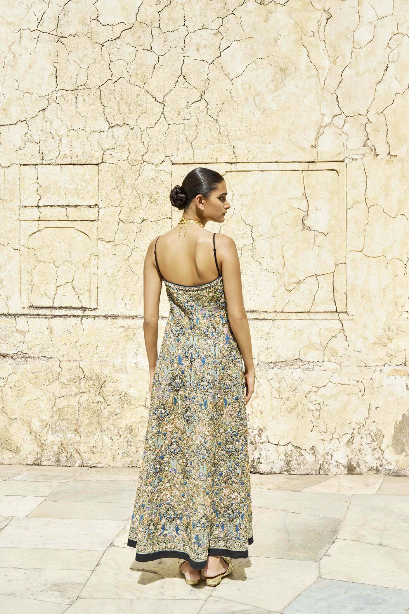 The top is designed in a minimalist yet sophisticated camisole silhouette, featuring ultra-fine spaghetti straps and a clean-cut neckline. It is meticulously crafted from a deep black fabric that acts as a canvas for a rich, “tapestry-style” embroidery. The bodice is encrusted with intricate floral and avian motifs in a vibrant palette of sapphire blue, rose pink, and golden ochre. The structured fit is enhanced with a smooth inner lining, providing both comfort and a refined, body-skimming shape.
