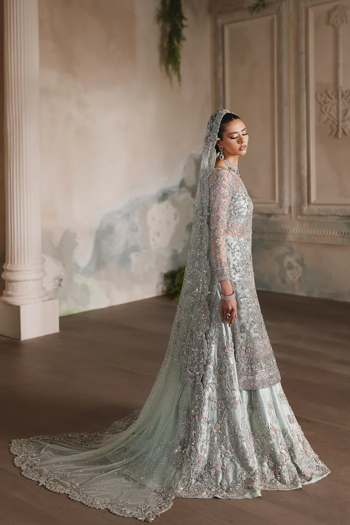 A serene mint bridal ensemble featuring a brocade lehenga, intricately hand-embroidered shirt, ethereal net dupatta with jewel detailing, and matching pouch. Exquisite craftsmanship ensures a timeless, elegant, and unforgettable bridal look.