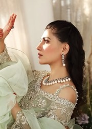 The mint green kameez is crafted from premium net fabric, enhanced with intricate Victorian floral patterns and delicately placed crystal embellishments. The silhouette is designed to offer a graceful drape and a contemporary yet regal wedding look.