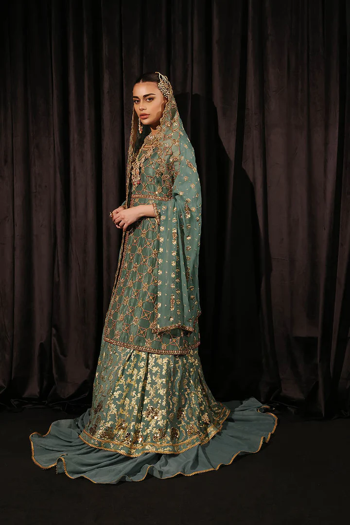 The kameez is tailored from exquisite mesuri fabric in a soft mint green shade. It features elaborate hand-applied embroidery, dabka, and kora detailing across the neckline, sleeves, and hemline. Subtle accents of sitara, tilla, and resham threads enhance the elegance of the design, creating a refined and majestic bridal look. A smooth lining ensures comfort while maintaining a polished silhouette.