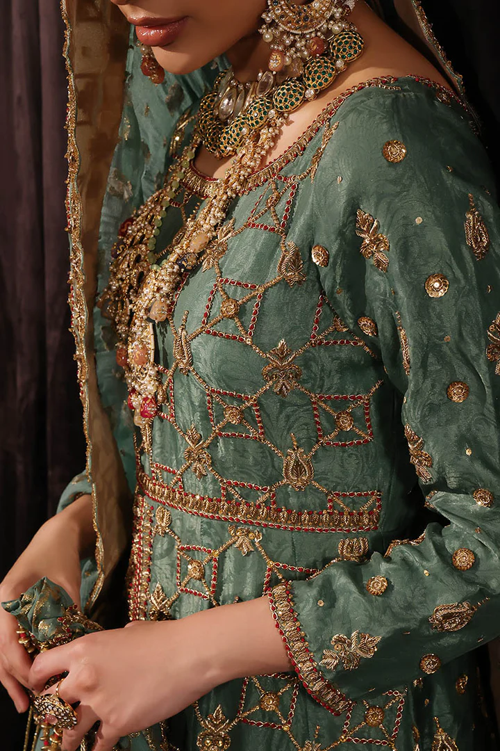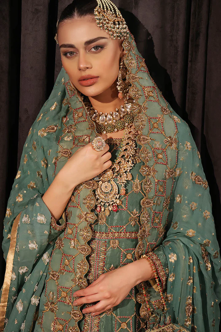 The lehenga is crafted from luxurious banarsi fabric in a coordinating green hue. It is adorned with handcrafted resham and mukaish work, adding depth, texture, and opulence to the ensemble. The full flare and structured waistband allow graceful movement while maintaining a regal and traditional bridal presence.