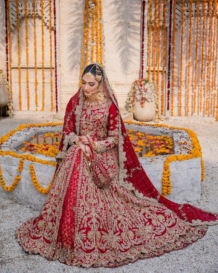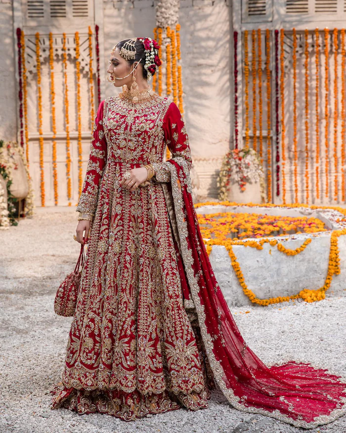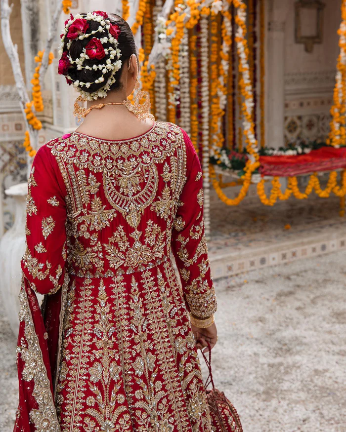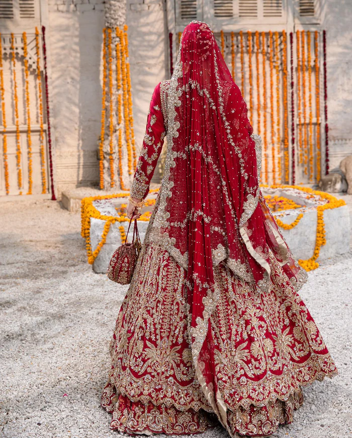 A deep red hue defines the outfit, symbolizing tradition, romance, and timeless bridal elegance.