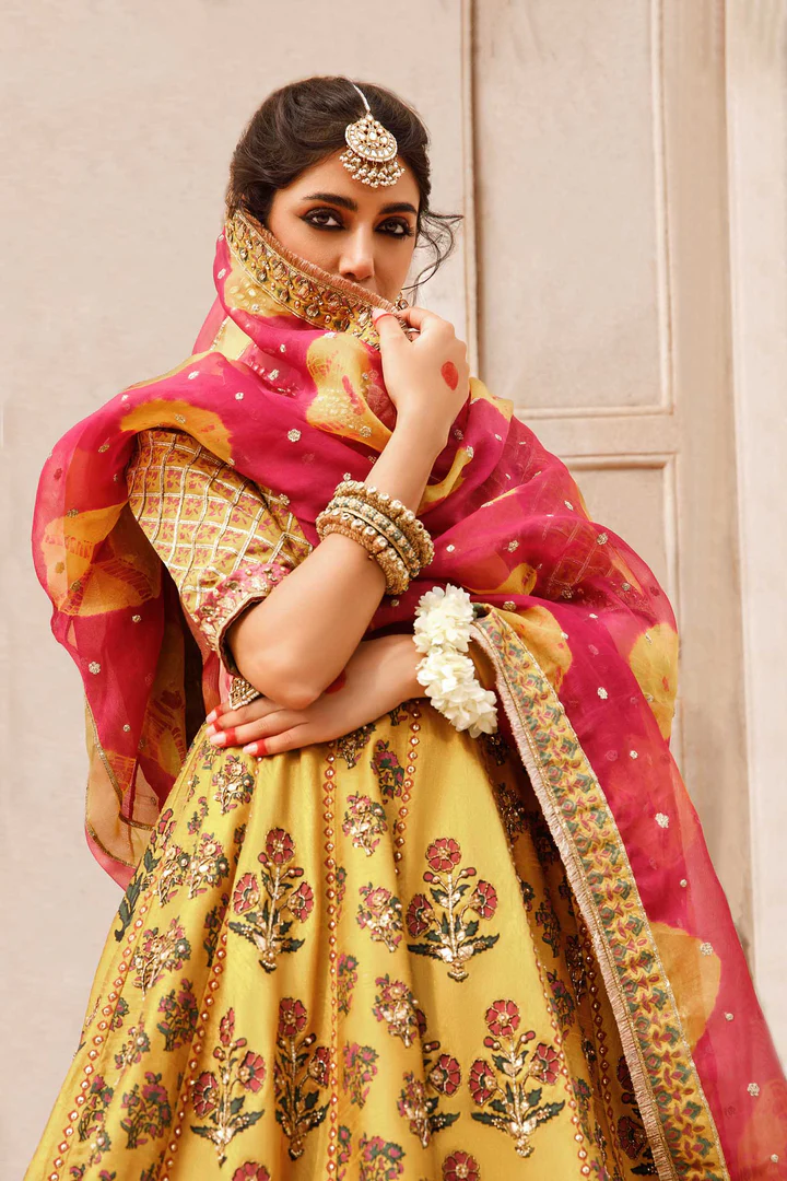 The choli is crafted from premium raw silk in a rich mustard shade and tailored with a refined, structured silhouette. Intricate hand detailing decorates the neckline, sleeves, and bodice, featuring traditional gold-toned craftsmanship inspired by classic bridal aesthetics. Fine floral accents and shimmering embellishments enhance the design, while a soft inner lining ensures comfort throughout long wedding celebrations.