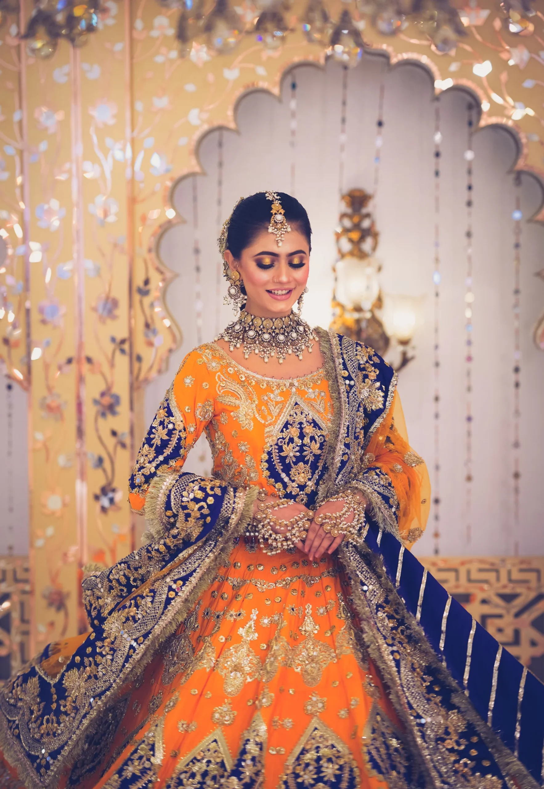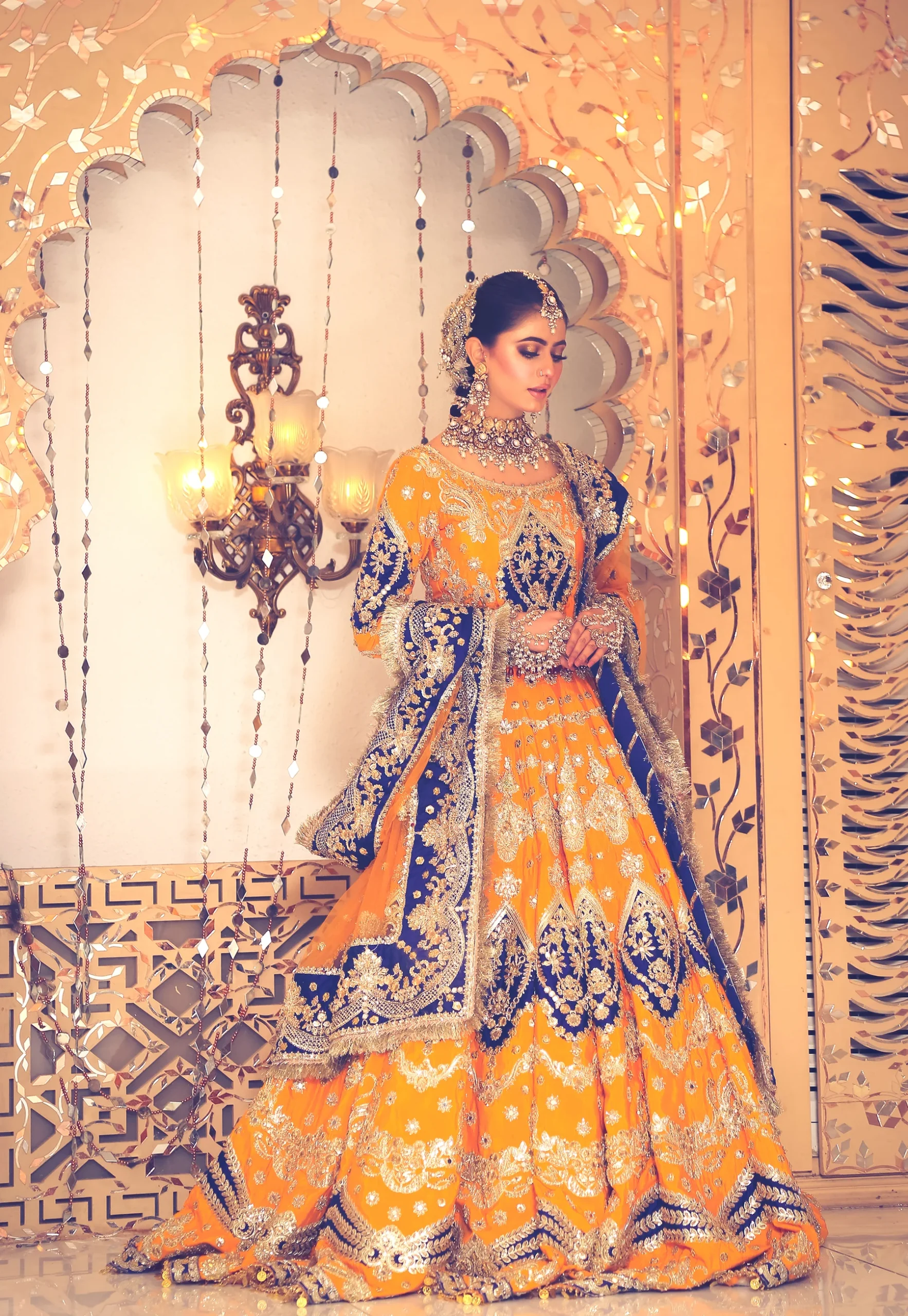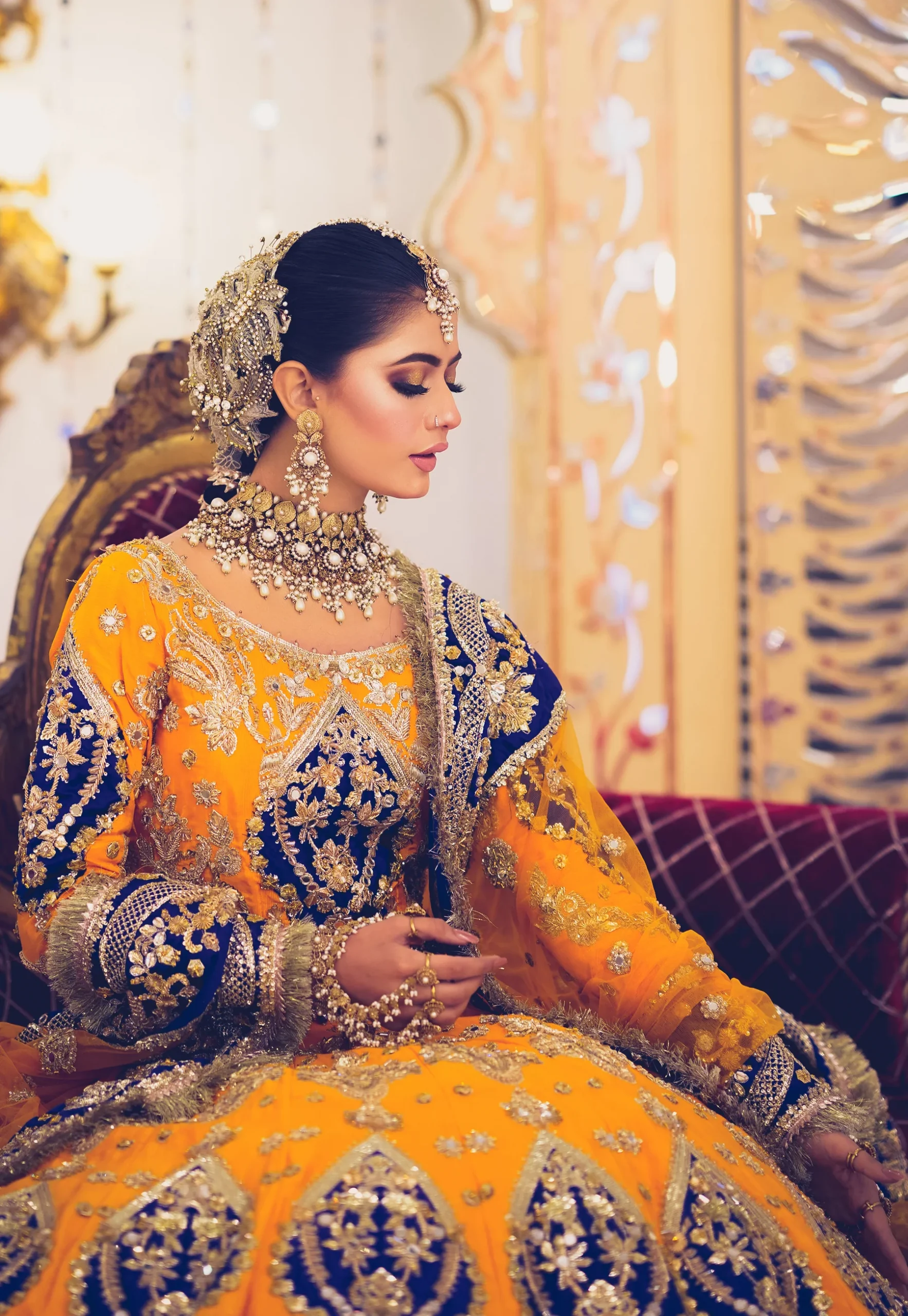 A vibrant mustard yellow and royal blue bridal lehenga, exquisitely handcrafted with gold zardozi, naqshi, and sequin embroidery—perfect for mehndi and mayun celebrations.