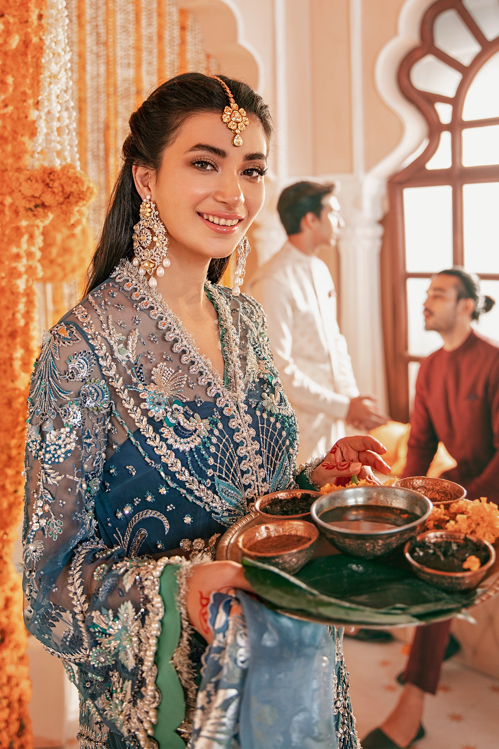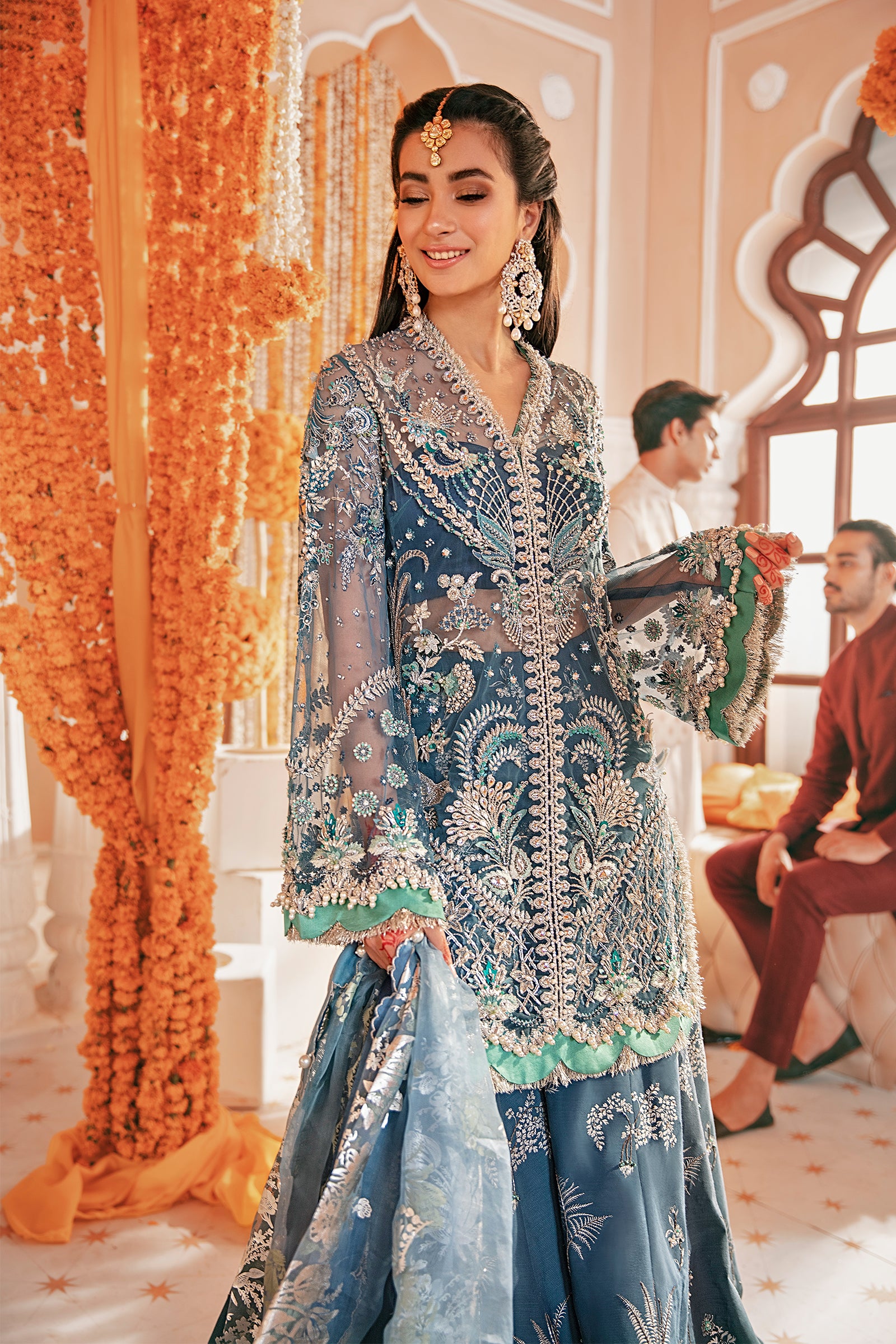 A bold teal couture ensemble designed to captivate, featuring a hand-embellished net jacket layered with shimmering silver details, paired with a raw silk sharara and an organza foil-printed dupatta.